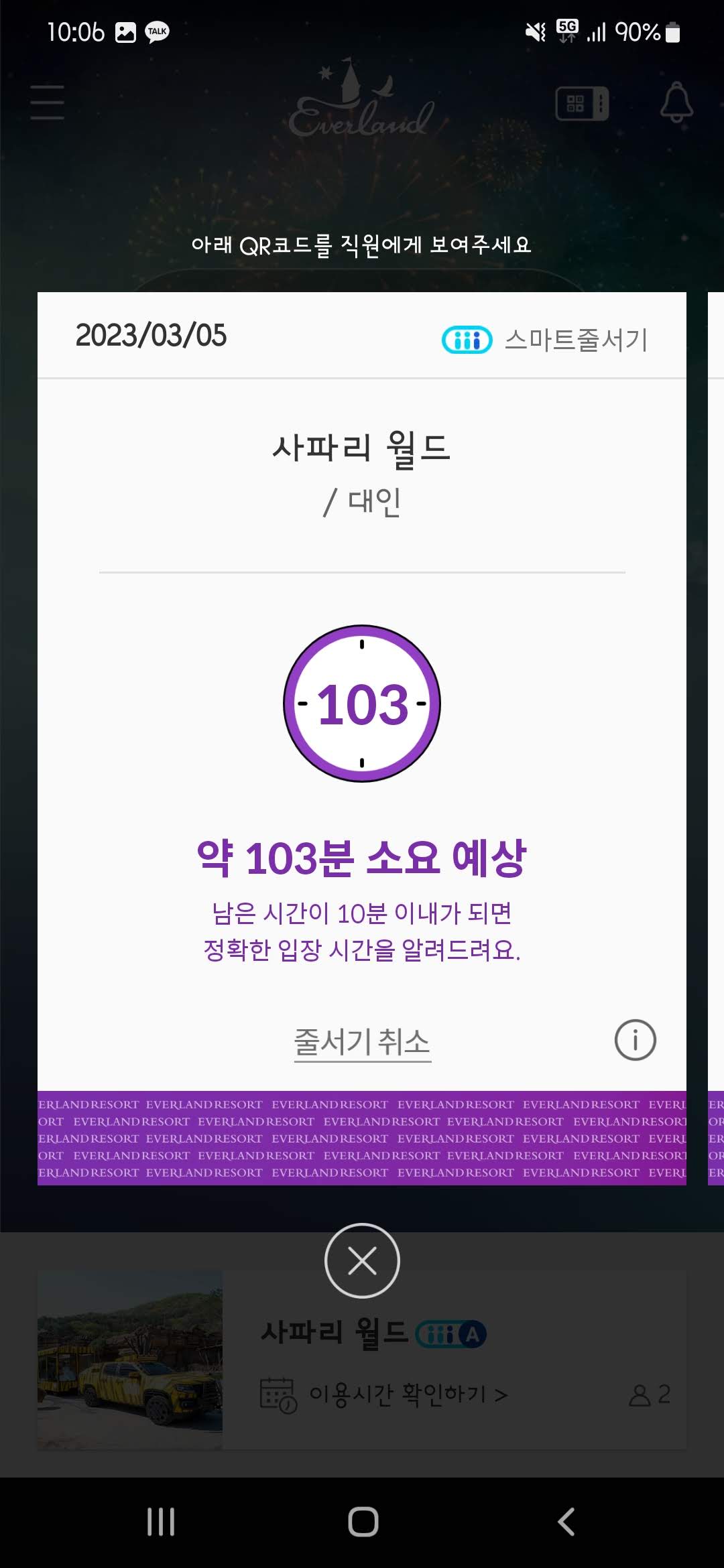 입장하자마자 사파리 예약을 걸었다. 캡처 시계에서 보다 시피 10시 입장 시작해서 QR 찍고 입장하자 마자 10시 6분에 성공하였다. 103분 소요 예상이므로 11시 반~12시쯤 관람할 수 있다. 엄청 빠듯하다.