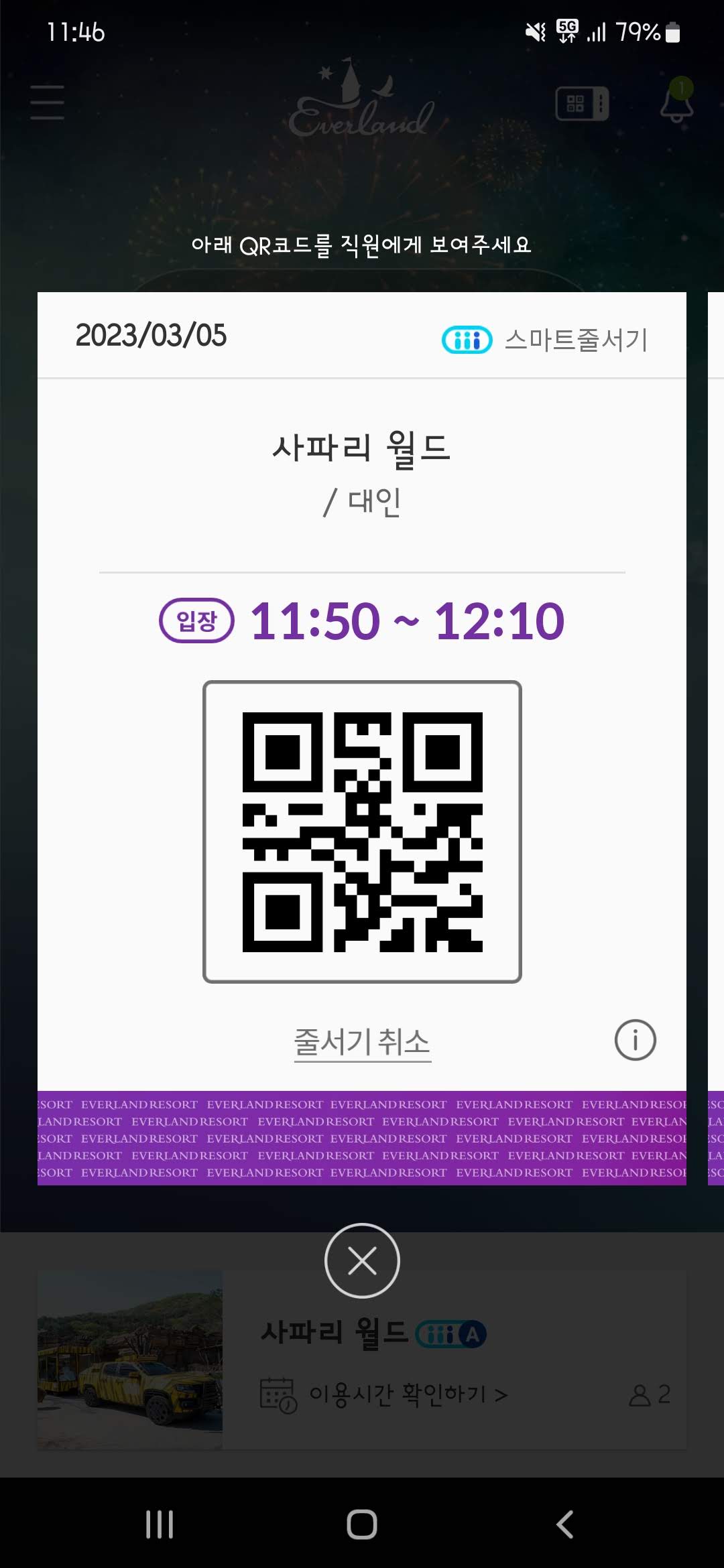 11시 45분쯤부터 아래와 같이 QR이 조회가 되고 사파리 앞에서 줄을 서고 바로 입장하면 된다. 이렇게 하더라도 입구에서는 줄을 또 서야 되긴 하지만 생각보다 금방 줄어들어서 크게 오래 기다리진 않는다. 하지만 아이가 사파리가 눈앞에 보이는데 기다리면 보채기도 하기 때문에 미리 QR 뜨기 전에 근처에서 시간을 때우기를 추천한다.