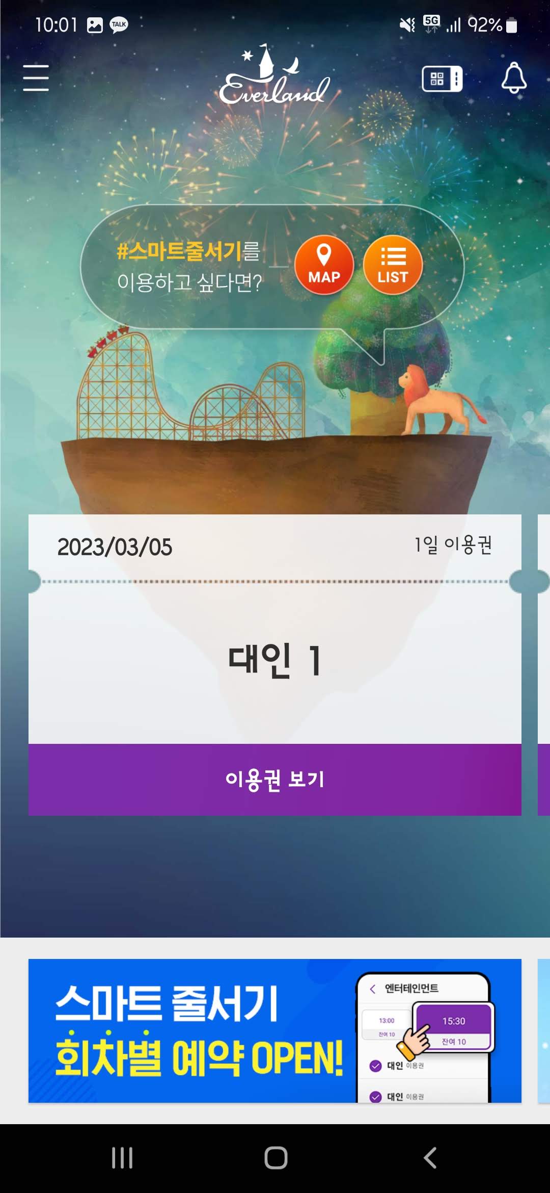 에버랜드 앱에 들어가서 미리 QR을 등록한다. 인원수에 맞게 모두 등록해야 하며 이 QR을 바로 보여주면서 입장하면 되고, 입장하자마자 원하는 놀이기구를 예약하면 된다.