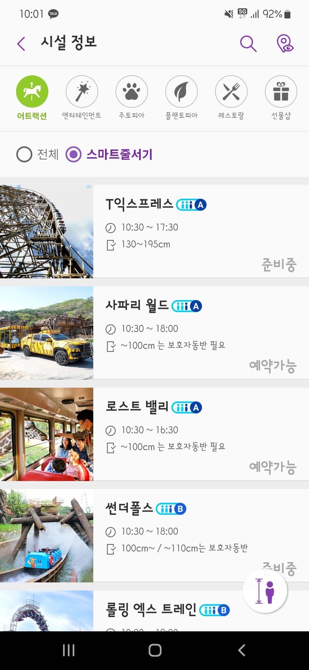 입장한 뒤 스마트줄서기를 통해 인기 있는 것들을 주로 빨리 예약하는 게 좋다. 사파리 월드, 로스트 밸리, T익스프레스와 같은 인기 놀이기구들은 같은 A타입으로 분류되어 이 것들 중 하나만 예약할 수 있다. B타입은 B타입들 중 하나만 할 수 있다. 탑승을 완료한 뒤 다시 A타입 중 하나를 예약할 수 있다.