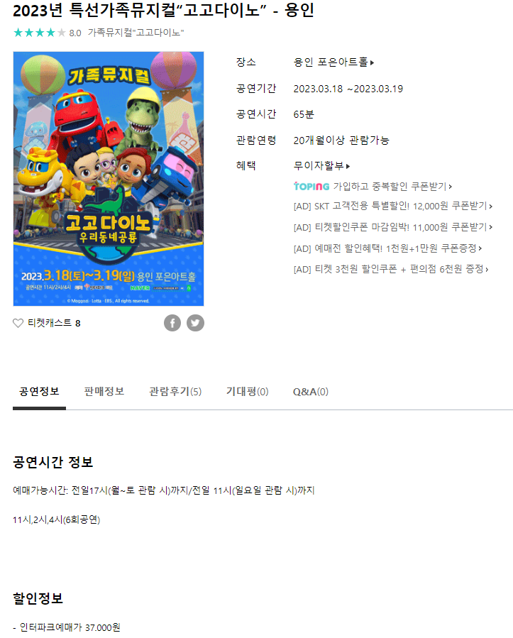 용인 포은아트홀 고고다이노 뮤지컬 티켓 가격