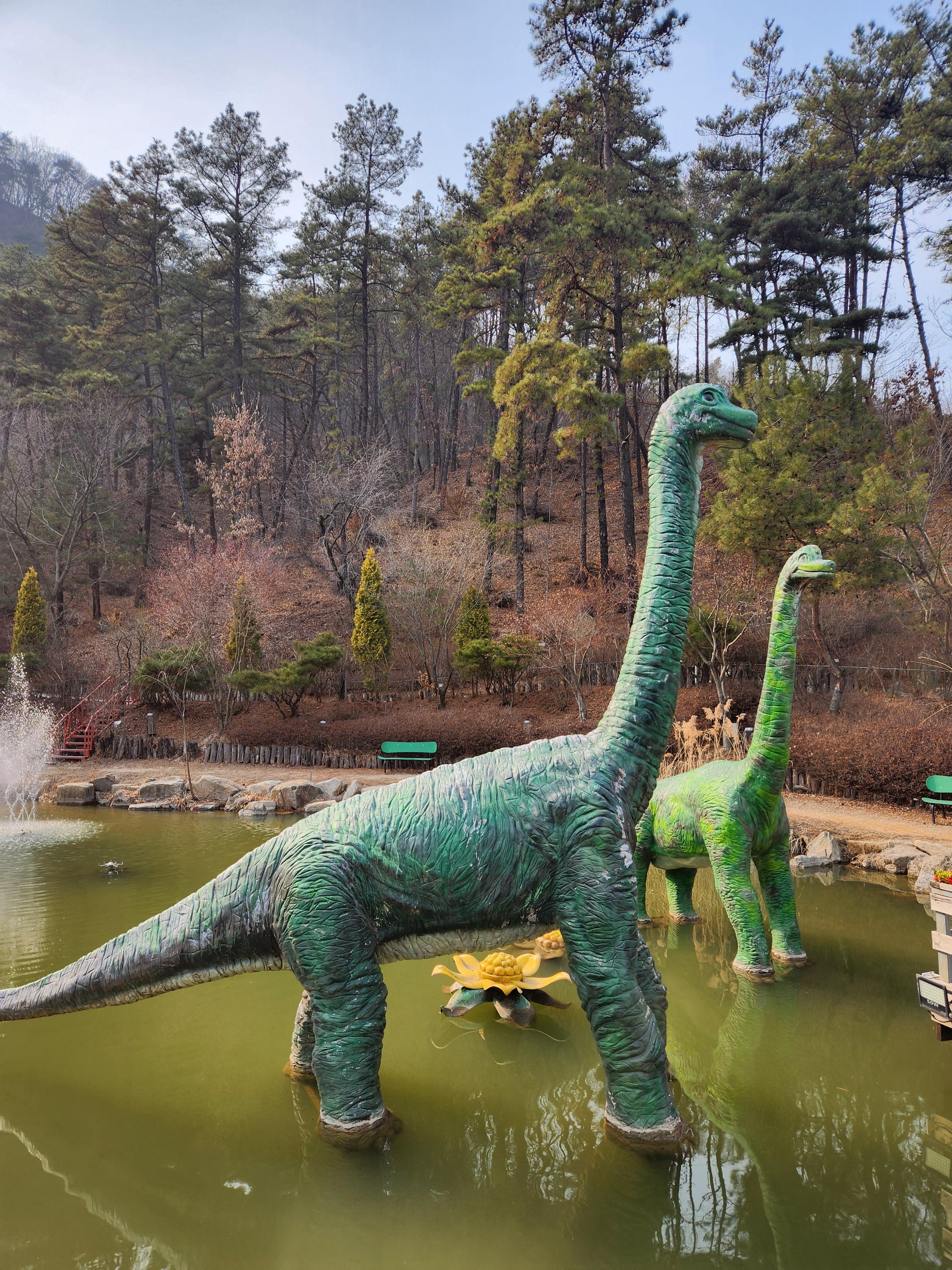 산책을 하면서 여러 가지 공룡 구조물들을 볼 수 있습니다. 처음으로 마주할 수 있는 자그마한 연못과 공룡입니다. 이런 식으로 중간중간 많이 배치되어 있어서 산책하면서 편하게 구경할 수 있습니다.