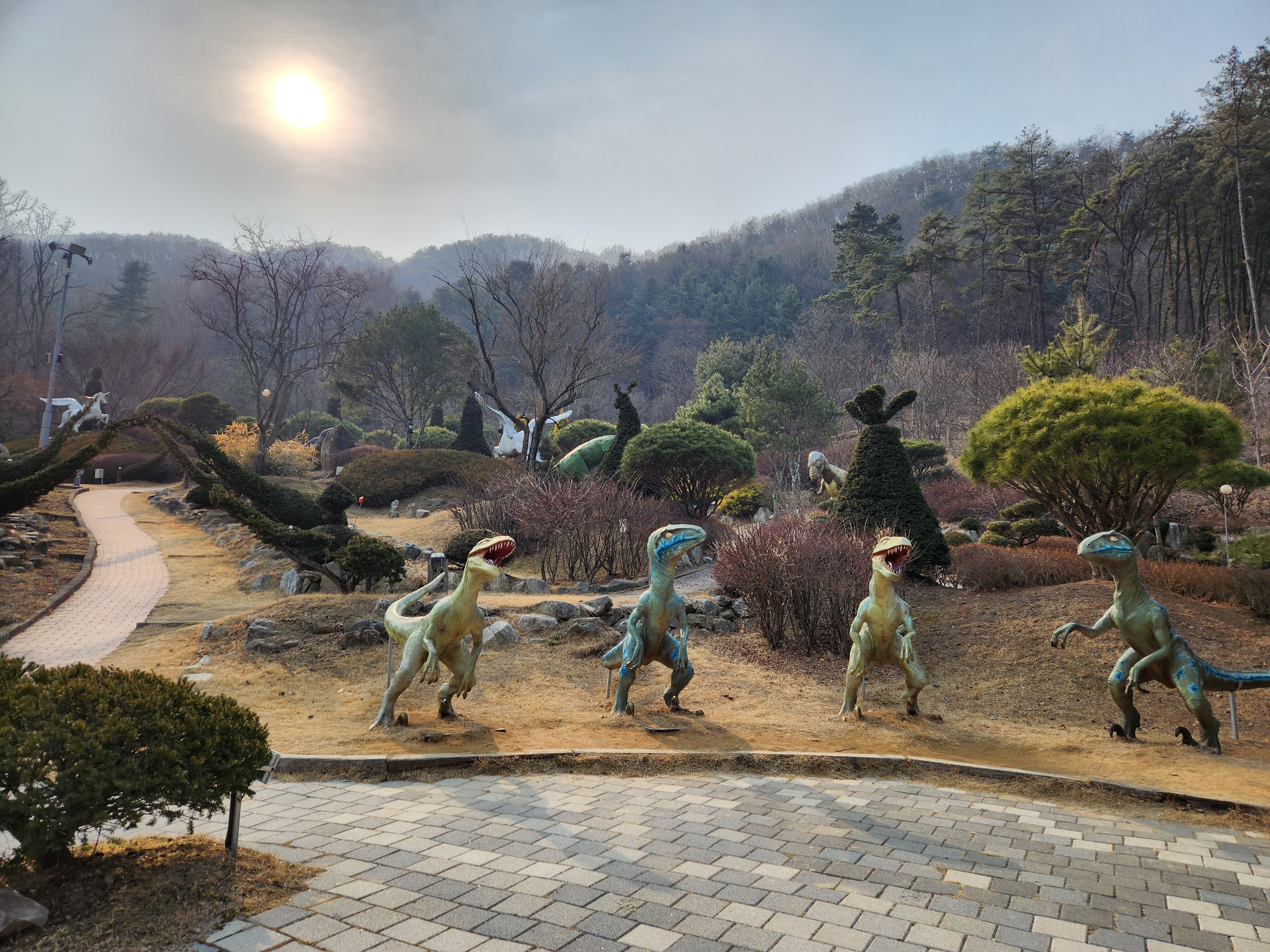 산책을 하면서 여러 가지 공룡 구조물들을 볼 수 있습니다. 처음으로 마주할 수 있는 자그마한 연못과 공룡입니다. 이런 식으로 중간중간 많이 배치되어 있어서 산책하면서 편하게 구경할 수 있습니다.