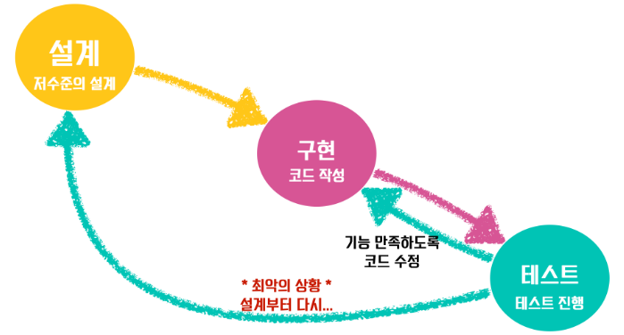 - 실패하면 다시 설계하거나 코드를 수정하며 반복한다.