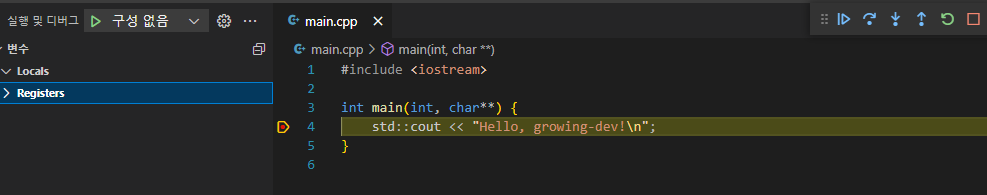 이후 CMake: Debug를 실행하면 아래와 같이 디버그 모드로 프로그램이 실행되고 순차적으로 실행하면서 디버깅할 수 있다.
