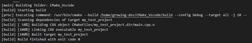 아래와 같이 매우 간단하게 main.cpp가 빌드되어서 my_test_project가 빌드된 걸 확인할 수 있다.