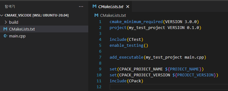 이렇게 완료가 되면 아래와 같이 build, CMakeList.txt, main.cpp 가 생성된다.