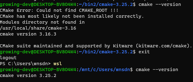 모든 설치 후 cmake --version을 통해 버전을 확인한다. 아래와 같은 문제가 발생한다면 재접속 후 다시 cmake --version을 하면 3.25로 제대로 업데이트된 걸 볼 수 있다.