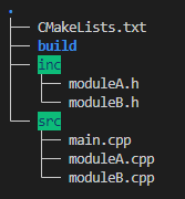 위와 같이 CMakeLists.txt와 build, inc, src로 구성된 프로젝트를 간단히 만들어 보도록 한다.