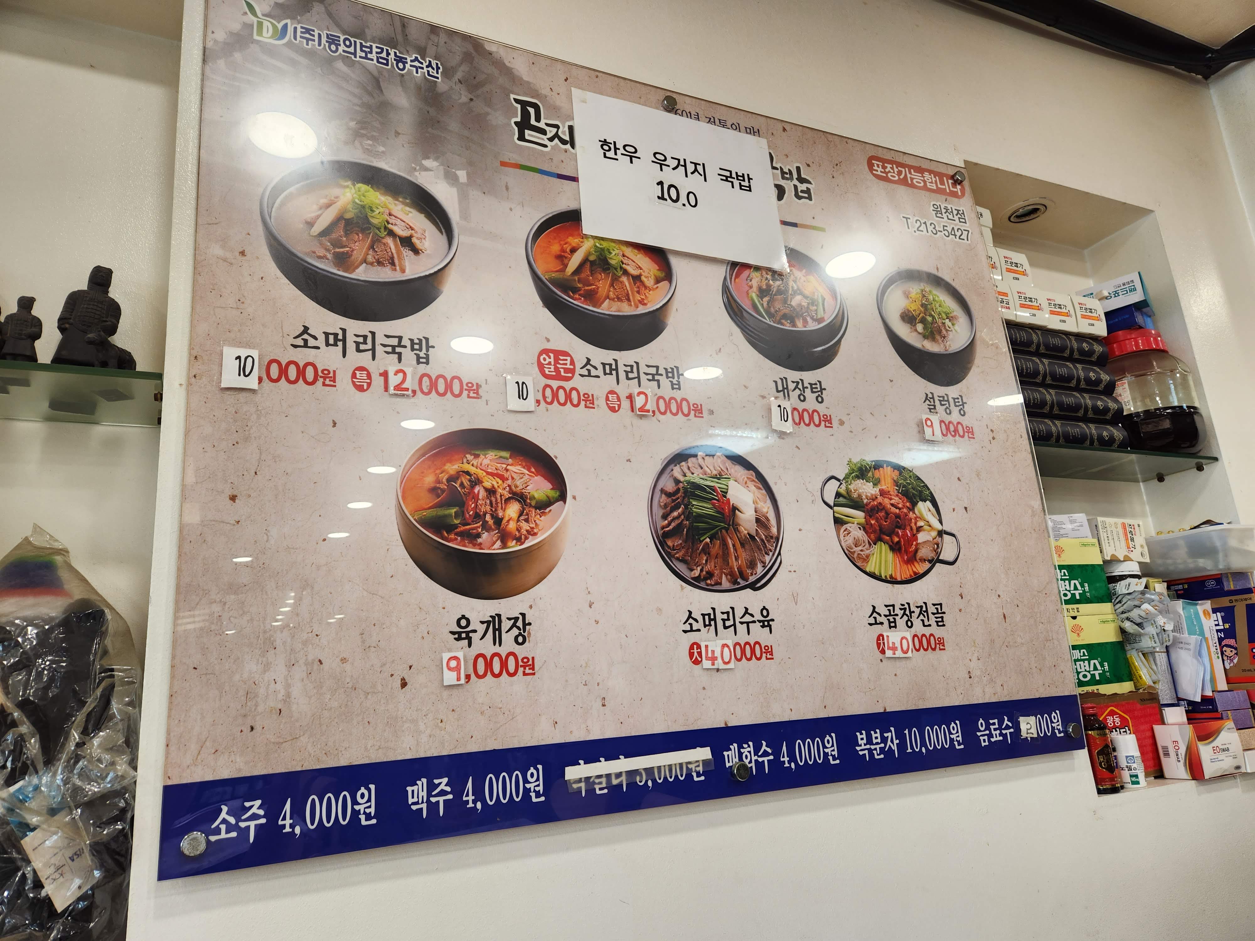 메뉴는 소머리국밥, 얼큰 소머리국밥, 내장탕, 우거지 국밥, 육개장 등이 있습니다.
