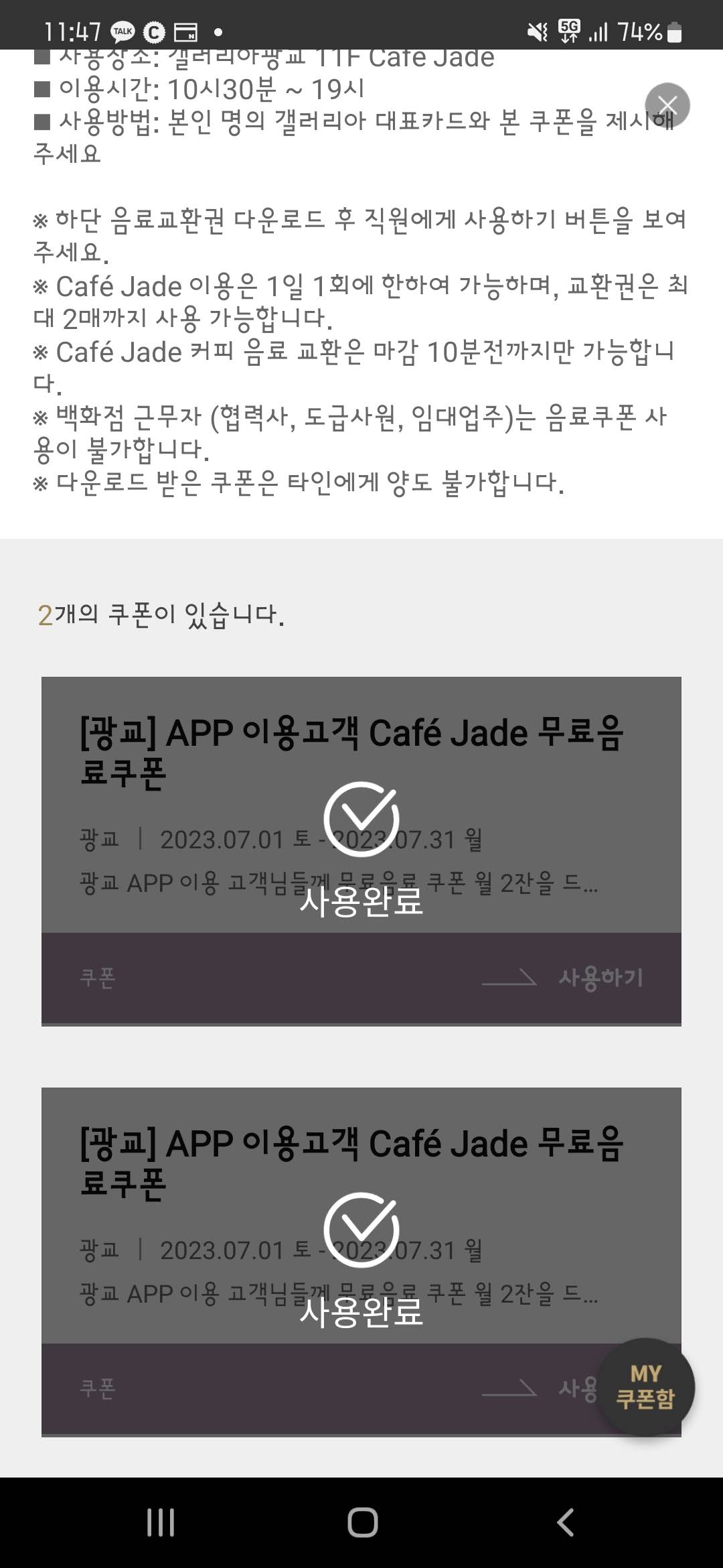 식사를 다 마치고 앱을 확인하던 도중 11층에 Cafe Jade라는 곳에서 무료 커피 2잔을 받을 수 있다고 해서 찾아갔습니다.