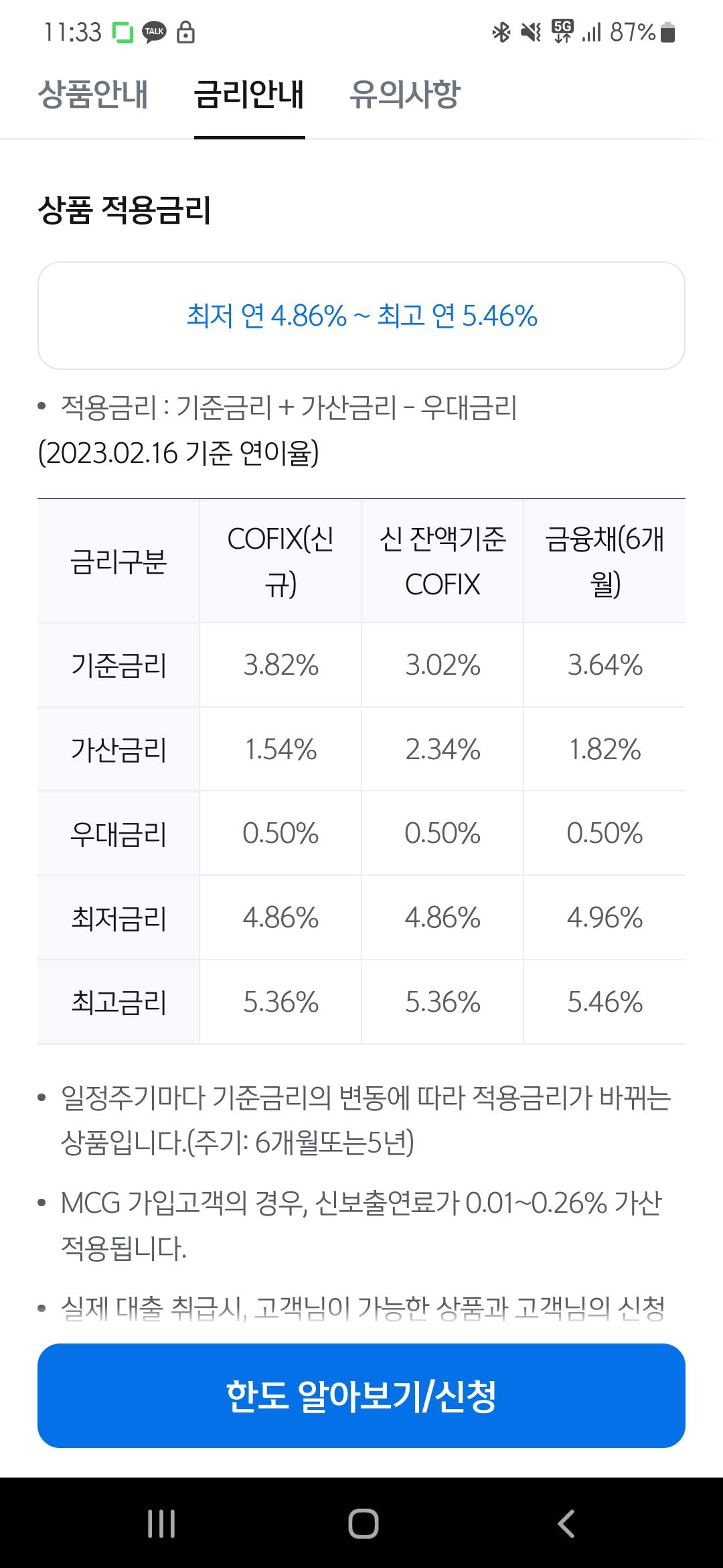 아래는 신한은행에서 조회해 본 2월 15일 자 기준 대출 금리이다.