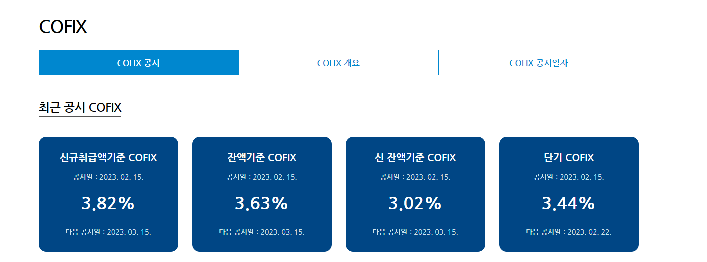 • 신규취급액기준 COFIX, 잔액기준 COFIX, 신 잔액기준 COFIX, 단기 COFIX로 구분된다.
