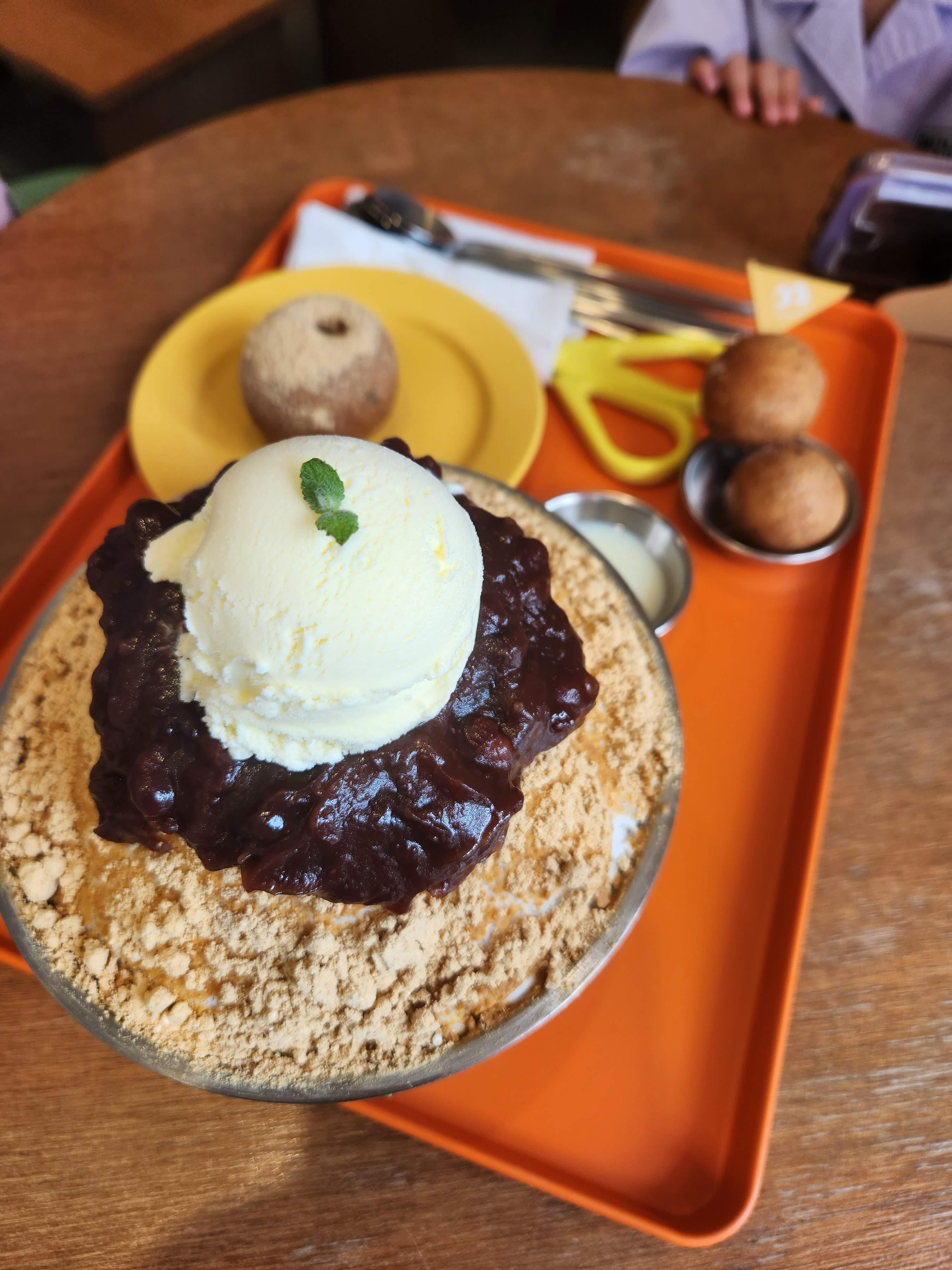 팥빙수에 아이스크림과 콩가루가 뿌려져 나오고 연유를 따로 내어주십니다. 맛은 아주 기본적이면서도 진한 맛의 우유빙수 맛이었습니다. 팥빙수를 전문적으로 판매하는 곳이 아닌데도 전문점 못지않게 매우 괜찮았습니다.