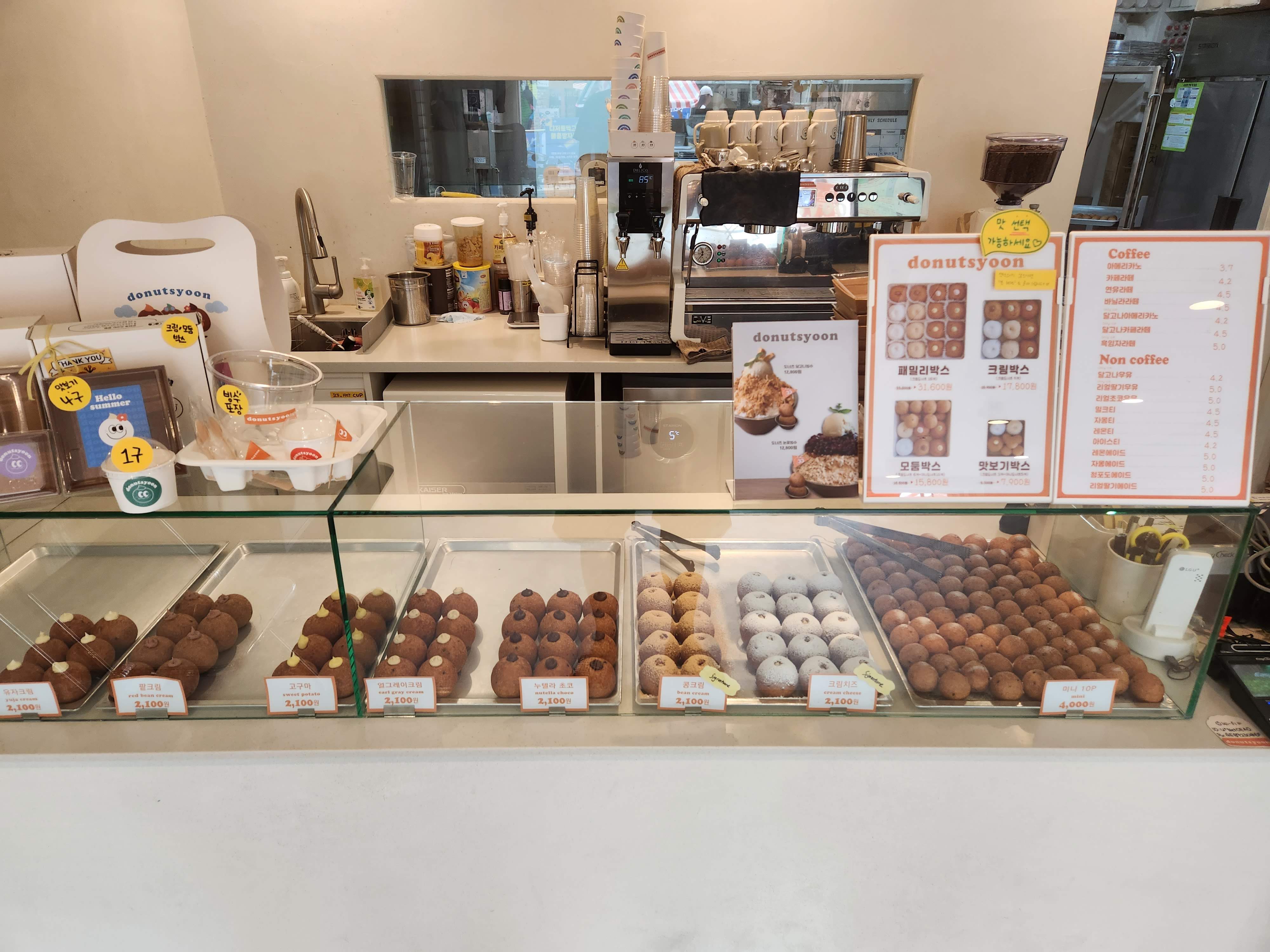 실내는 테이블이 4개정도 밖에 안 되는 작은 공간입니다. 사실 대부분의 분들이 도넛을 포장해 가는 사람이 많아서 공간이 별로 필요 없나 봅니다. 도너츠윤은 자체 굿즈들이 많아서 한 번씩 가면 간단히 구경하는 재미도 있어서 좋은 것 같습니다.