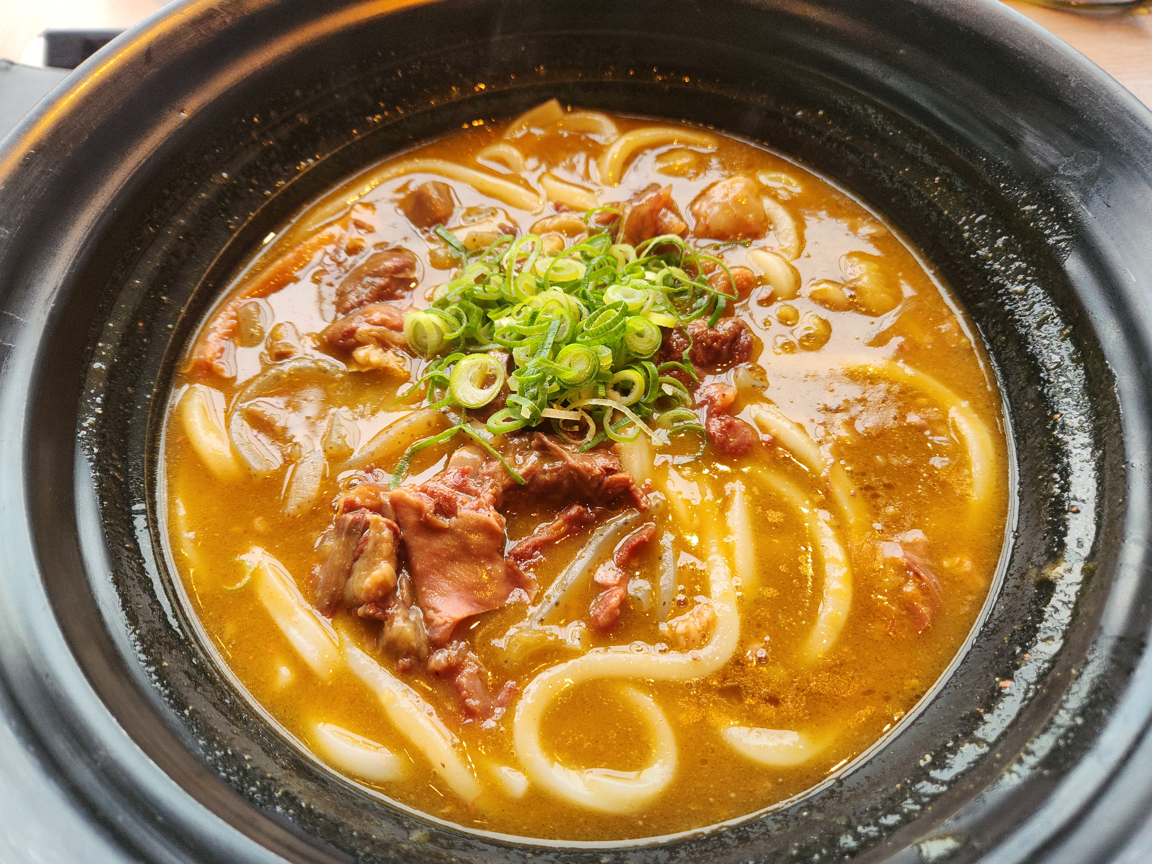 소고기 카레 우동: 진한 매콤한 카레 국물에 부드러운 고기가 들어 있어 든든했어요.