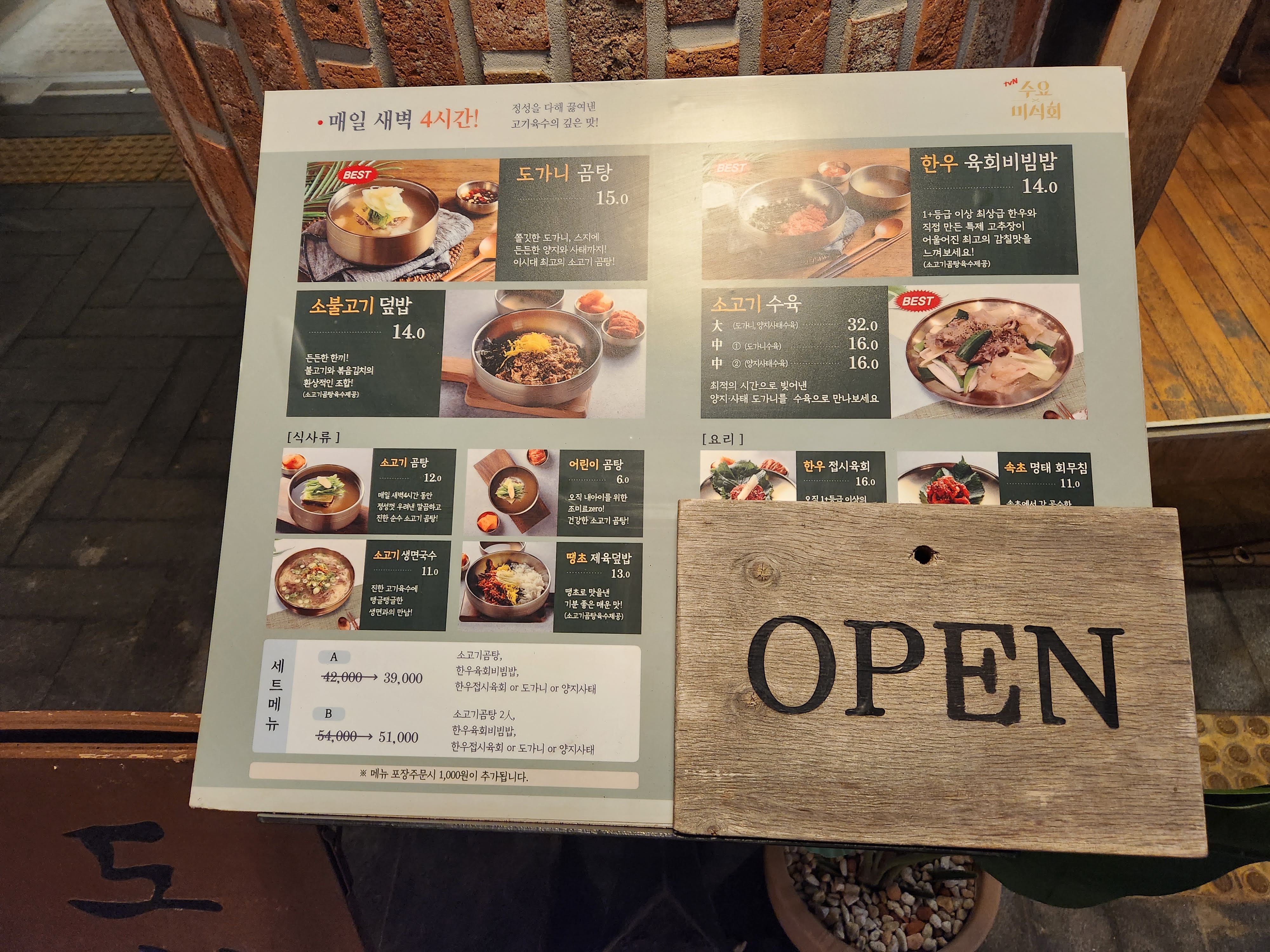 소고기 곰탕과 한우 육회 비빔밥이 대표 메뉴인 것 같다. 가격대는 꽤 있는 편이다.