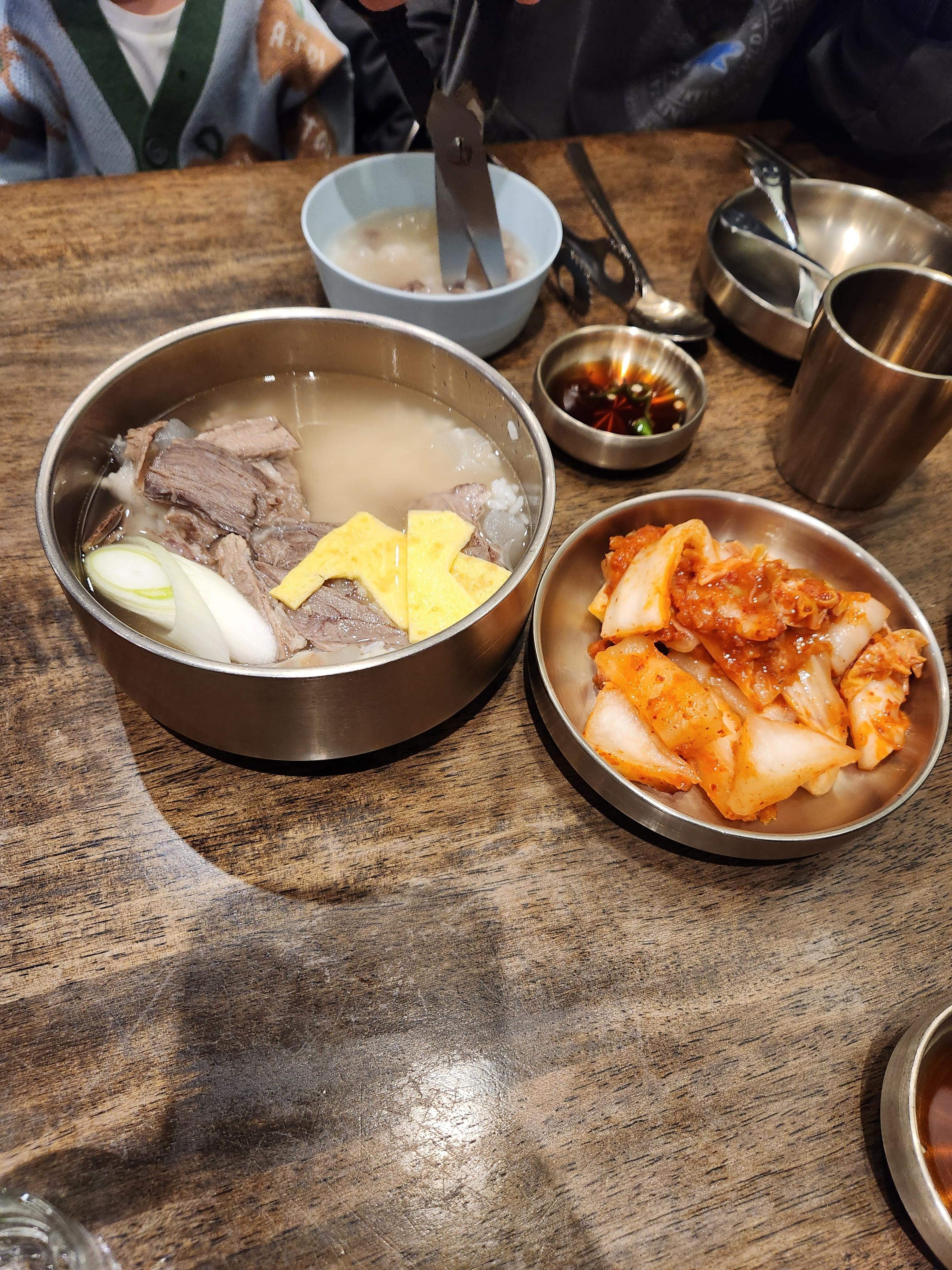 김치와 깍두기 외에 특별한 반찬은 없었다. 김치와 깍두기를 셀프로 원하는 만큼 덜어 먹는 시스템이었고 곰탕과 함께 고추가 들어간 찍어먹는 소스가 함께 나왔다. 곰탕은 생각보다 빨리 나왔다. 아이 그릇과 아이 식기 그리고 추가적인 가위와 집게를 요청했다. 배가 고파서 나오자마자 아이 그릇에 덜어 먹느라 제대로 찍진 못했다. 나중에 고추를 빼고 소스를 하나 더 달라고 했는데 친절하게 하나 더 주셔서 서비스도 괜찮았다.