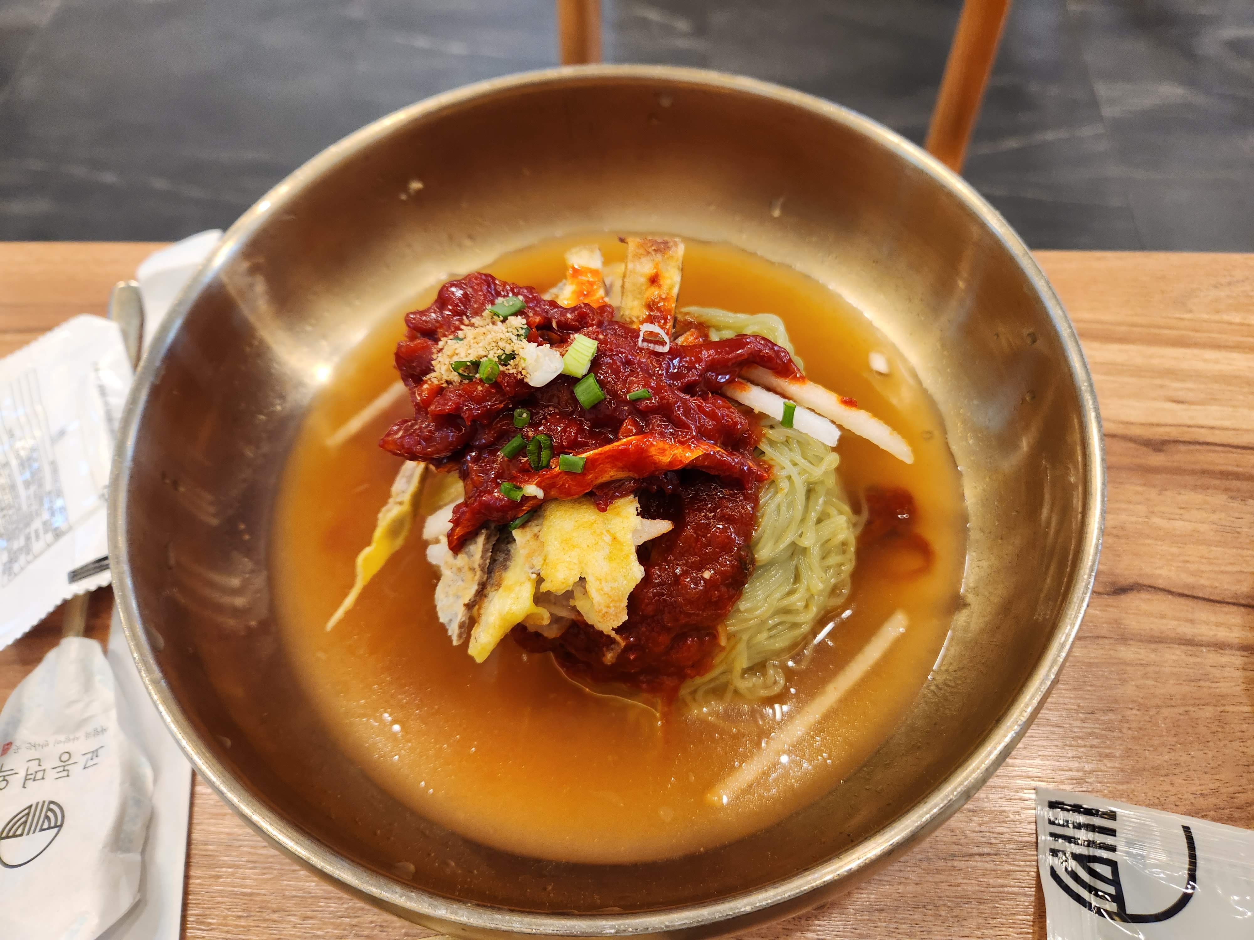 가장 대표메뉴로 보이는 교동 특 냉면이다. 회무침과 육전이 포함된 국물이 자작한 비빔냉면 스타일이다. 한입 먹는 순간 너무 맛있었다. 너무 자극적이지도, 너무 싱겁지도 않은 간이 딱 맞는 비빔냉면이었다.