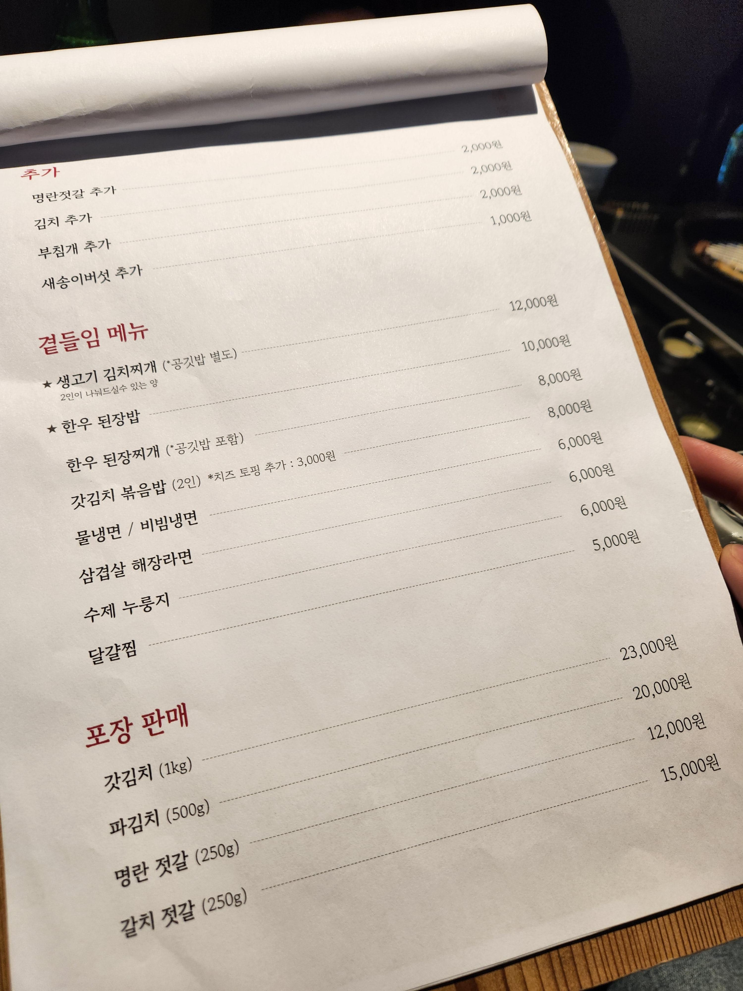 곁들임 메뉴를 특별히 먹진 않았지만 다음에 방문하면 생고기 김치찌개나 된장밥을 시켜보고 싶었다. 소주 안주로 고기를 먹고 나서 고기를 시키기엔 뭔가 부담스럽지만 아쉬울 때 배도 채울 겸 시키기 좋은 안주 겸 식사 곁들임 메뉴라고 생각했다.