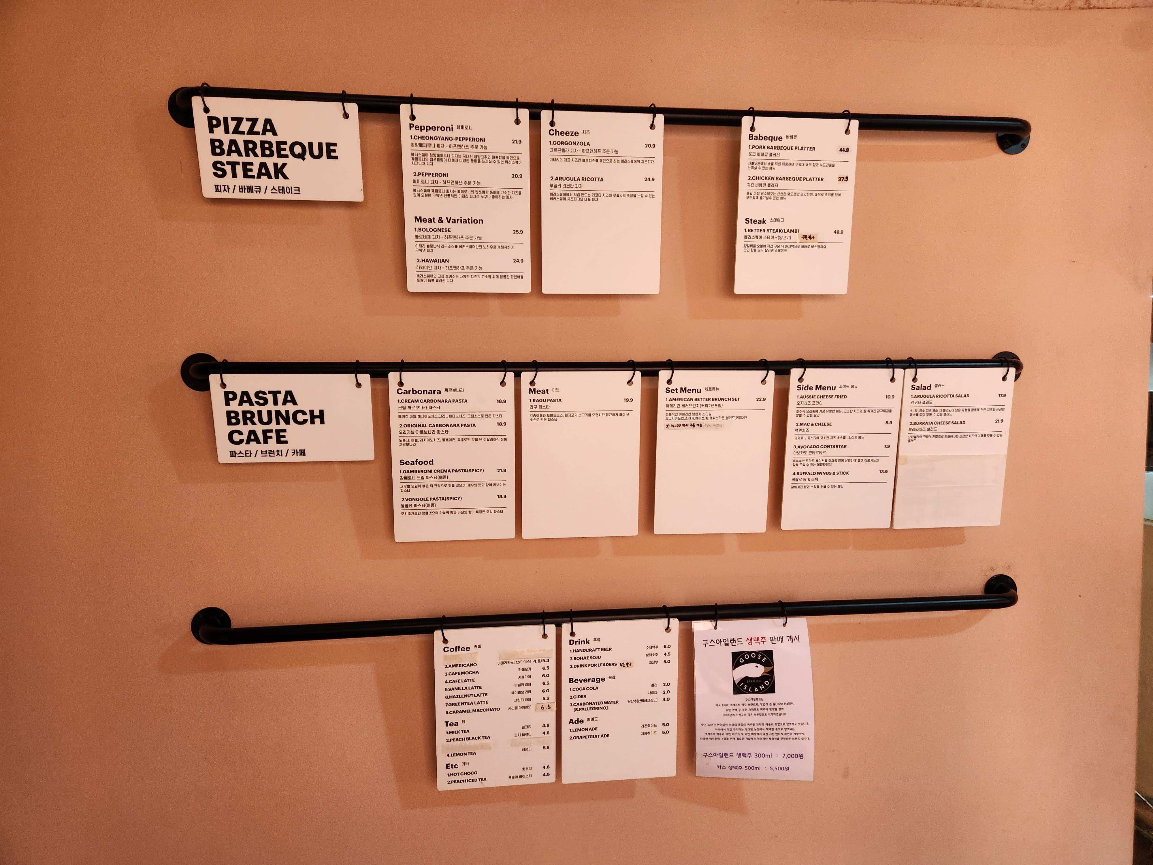메뉴판이 아래와 같이 붙어져 있어서 잘 보이진 않겠지만, 피자, 바비큐, 스테이크, 파스타, 브런치 메뉴, 커피, 맥주 등을 판매하고 있다. 피자는 하프 앤 하프도 가능한데 루꼴라 피자는 안된다고 했다. 우리는 루꼴라 피자와 샐러드 하나씩 주문하고 콜라와 구스아일랜드 생맥주도 주문했다.