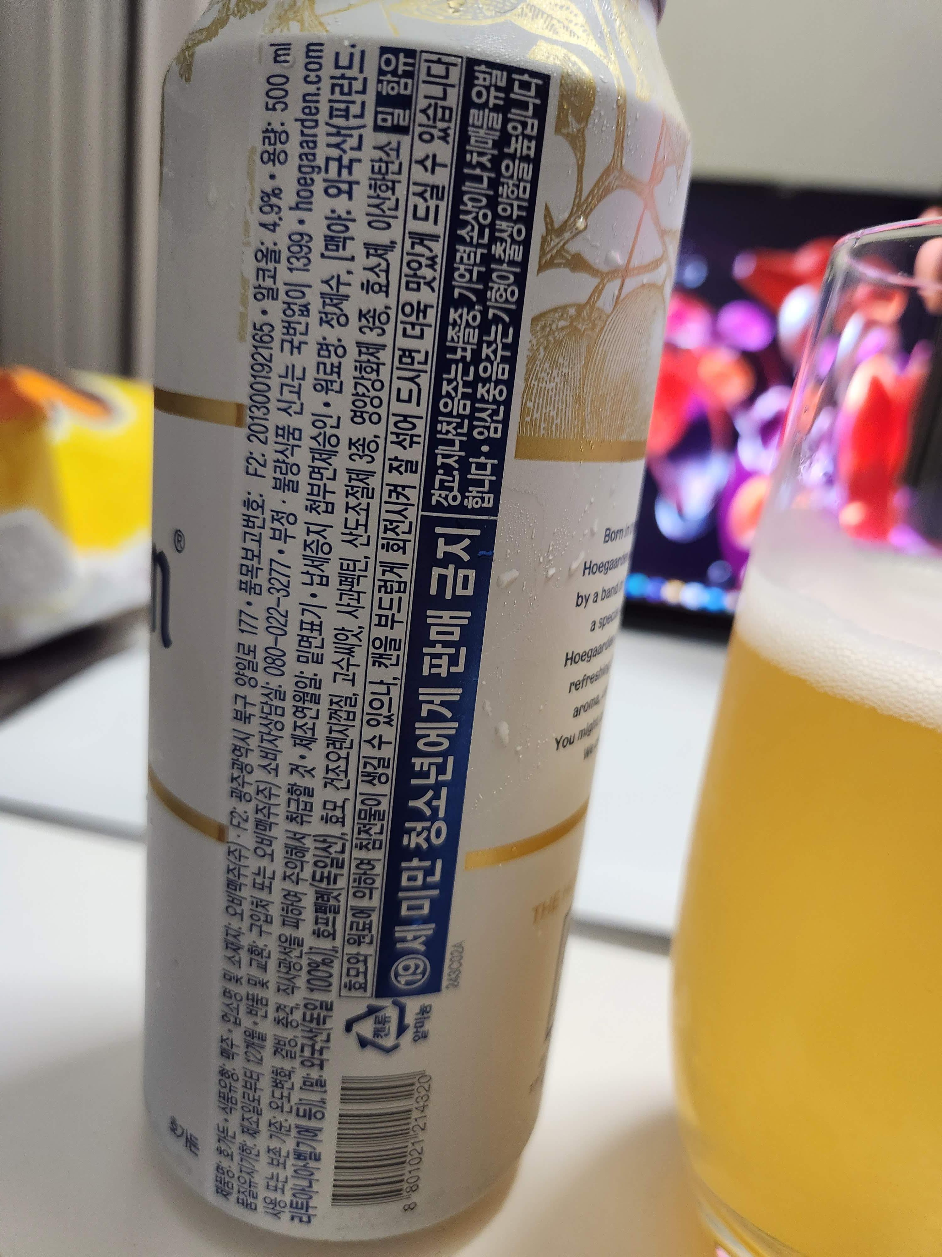 가장 유명하고 무난한 밀맥주 중에 하나입니다. 특유의 시트러스한 향으로 인해 많은 사람들이 가볍게 마시기 좋은 맥주인 것 같습니다. 정확하진 않지만 예전에 맥주집에서 호가든을 생맥주로 마신적이 있는데 알코올이 8도 정도였나 그래서 2차로 가볍고 상쾌하게 호가든 생맥을 마시자 해서 갔다가 기억을 잃은 적이 있습니다.. 탄산감이 나쁘지 않고 시원하게 잘 넘어갑니다. 특히 설명에도 나와 있듯이 밀맥주의 특성상 침전물이 조금 생길 수 있어서 회전시켜 잘 섞어 마시면 더 맛있게 마실 수 있는 것 같습니다.