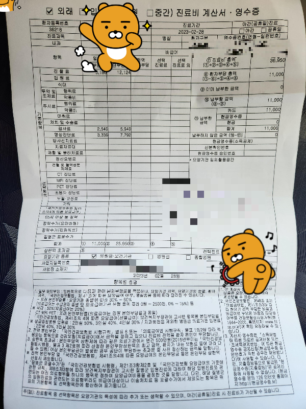 아래 사진은 내가 최근에 사용한 진료비 계산서, 영수증이다. 이 영수증으로 내가 신청하고 얼마를 수령했을까? 이 과정을 이해하려면 위에서 말한 5가지를 이해하면 된다. 이제 하나씩 알아가면서 어떻게 이렇게 계산이 되었는지 이해해 보도록 한다.