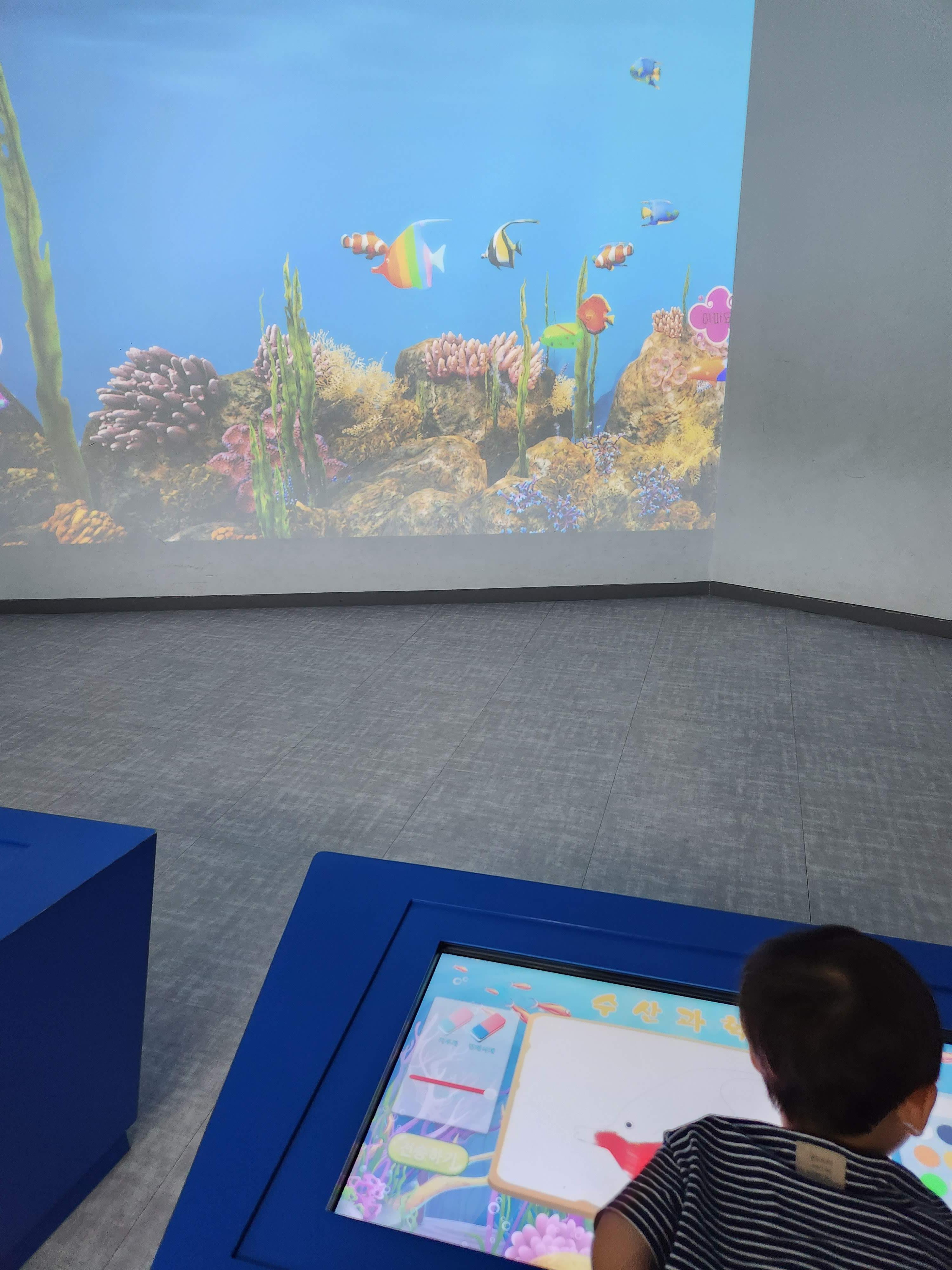 키즈카페에 보통 있었던, 색칠하면 화면에 나오는 시설도 있었습니다. 주로 여자 아이들이 많았습니다. 예쁘게 색칠하고 전송버튼을 누르면 앞 프로젝터 화면에 색칠한 대로 물고기가 나오는 것인데, 역시 아이들은 신기해했습니다.