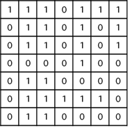 우선 [그림 1]과 같이 정사각형 모양의 지도가 있다. 1은 장애물이 있는 곳을, 0은 도로가 있는 곳을 나타낸다.