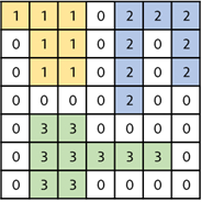 당신은 이 지도를 가지고 연결된 장애물들의 모임인 블록을 정의하고, 불록에 번호를 붙이려 한다. 여기서 연결되었다는 것은 어떤 장애물이 좌우, 혹은 아래위로 붙어 있는 경우를 말한다. 대각선 상에 장애물이 있는 경우는 연결된 것이 아니다.