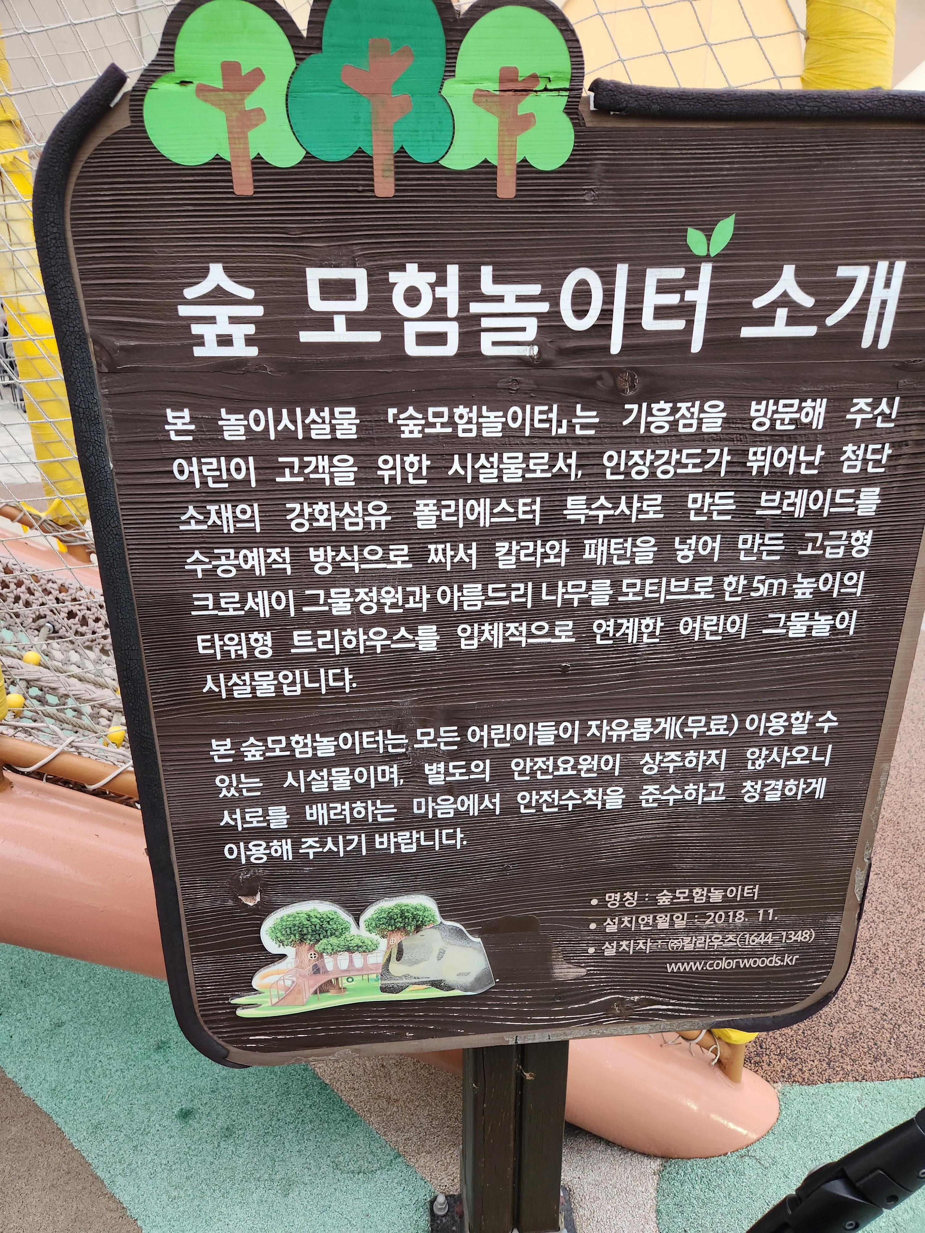 정식 명칭이 숲 모험놀이터 인 것 같다. 무료이고 별도의 안전요원이 상주하지 않는다고 되어 있는데 가끔 가보면 주말 피크시간에는 한두 명이 있었던 것 같다. 위에서도 말했지만 아이들이 흥분하다 보니 간혹 다치는 경우가 있긴 한가 보다.