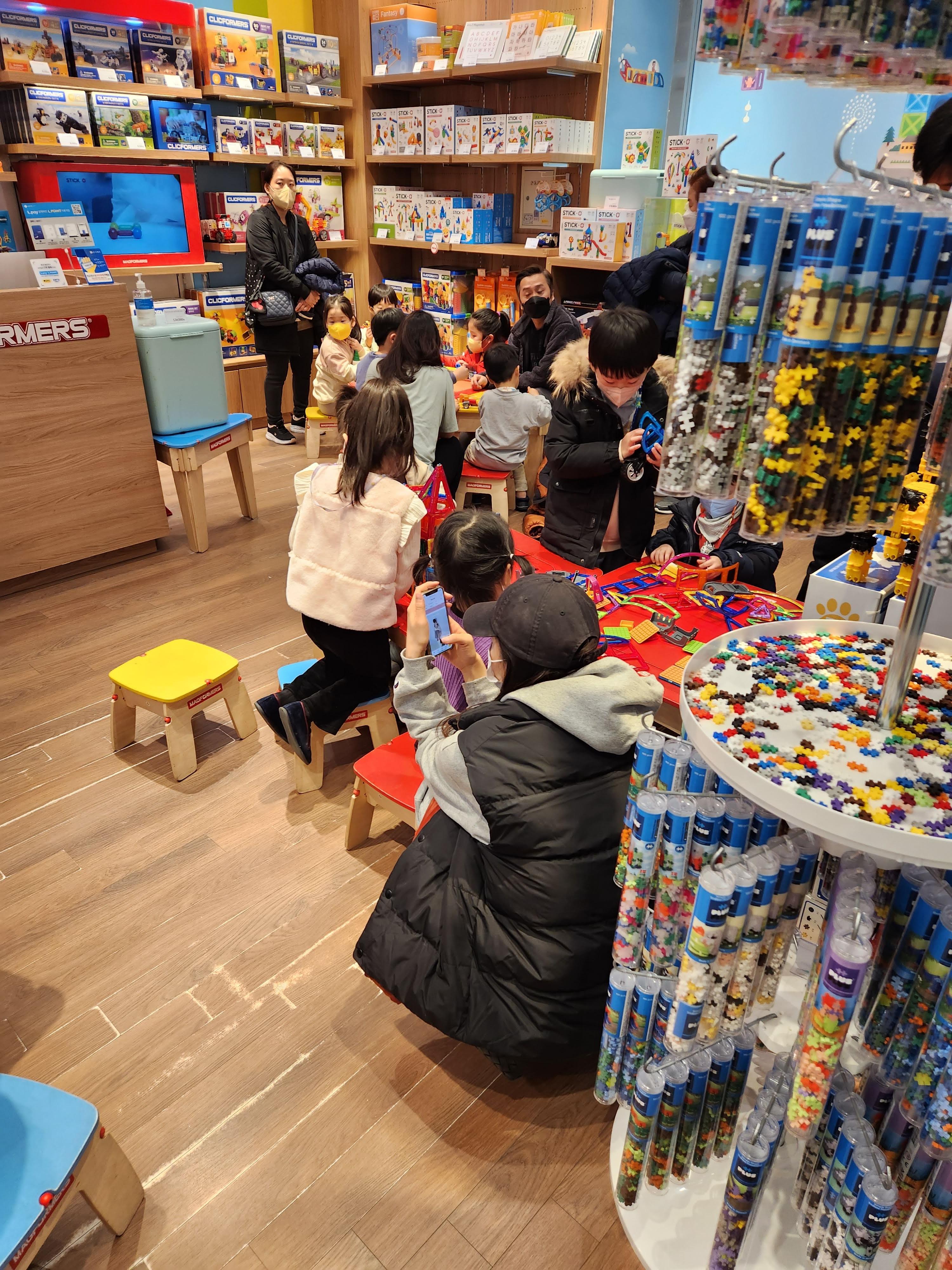 맥포머스를 체험해 볼 수 있는 판매점이 있다. 아이들이 여기를 못지나치는 이유는 맥포머스가 꽤 많이 널려 있고 테이블과 의자가 갖추어져 있어서 관심을 많이 갖는다. 막상 사는 아이들은 그렇게 많지 않았다. 할아버지의 도움으로 맥포머스 세트를 구입했다. 예전에는 아직 맥포머스를 하기에는 좀 어리다고 했는데 이제 좀 커서 그런지 어느 정도 잘 다루는 것 같다. 나중에 갖고 논 후기를 써보아야겠다.