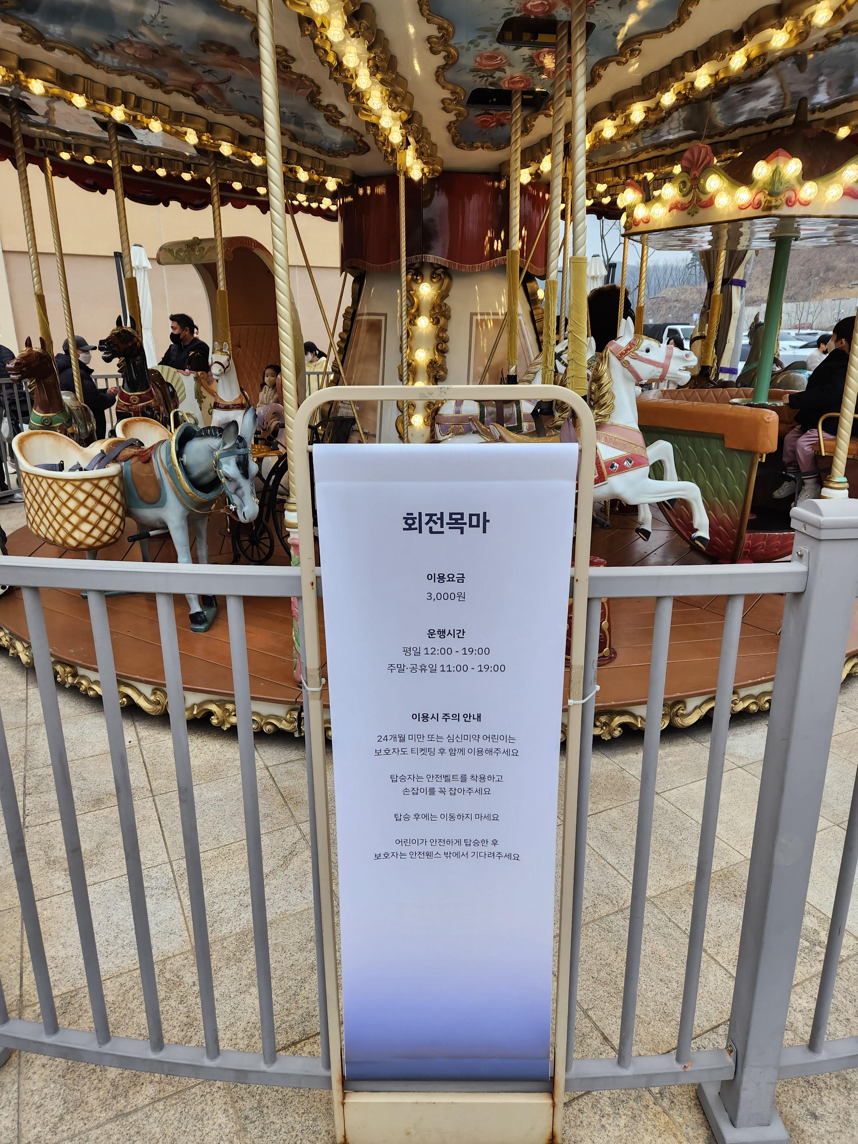 놀이터 바로 옆에 회전목마가 있다. 꽤 고급스럽게 생겼고 자판기에서 결재해서 줄 서서 타는 시스템이다. 예전에는 2천 원이었는데 올라서 3천 원이 된 것 같다. 오늘은 다행히 타고 싶다고 안 하고 지나갔다.