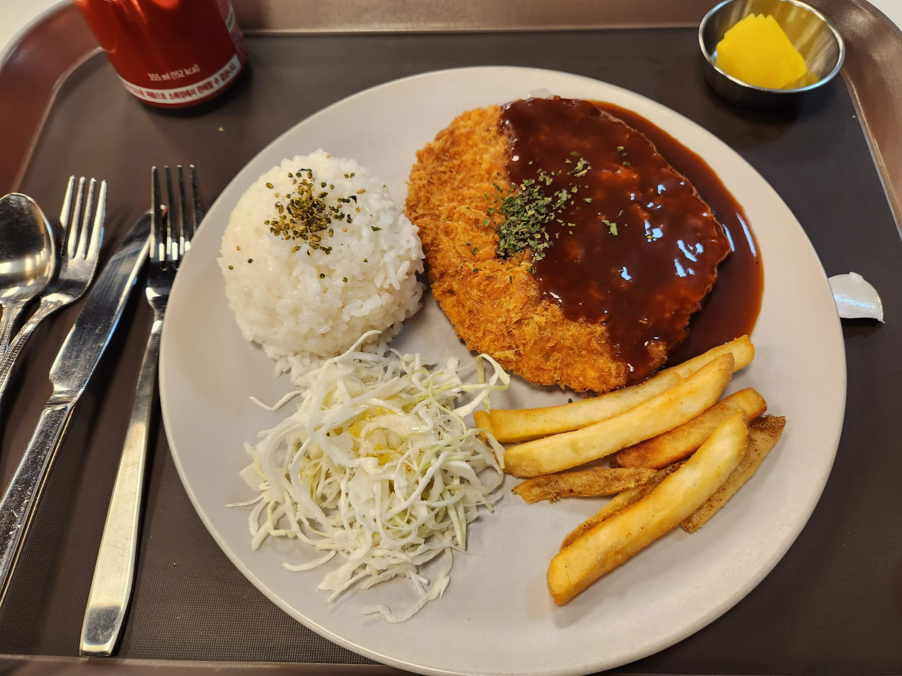 돈가스는 아래와 같이 나왔습니다. 돈가스와 밥, 감자튀김이 같이 나왔고 생각보다 먹을만해서 아이가 매우 잘 먹었습니다.