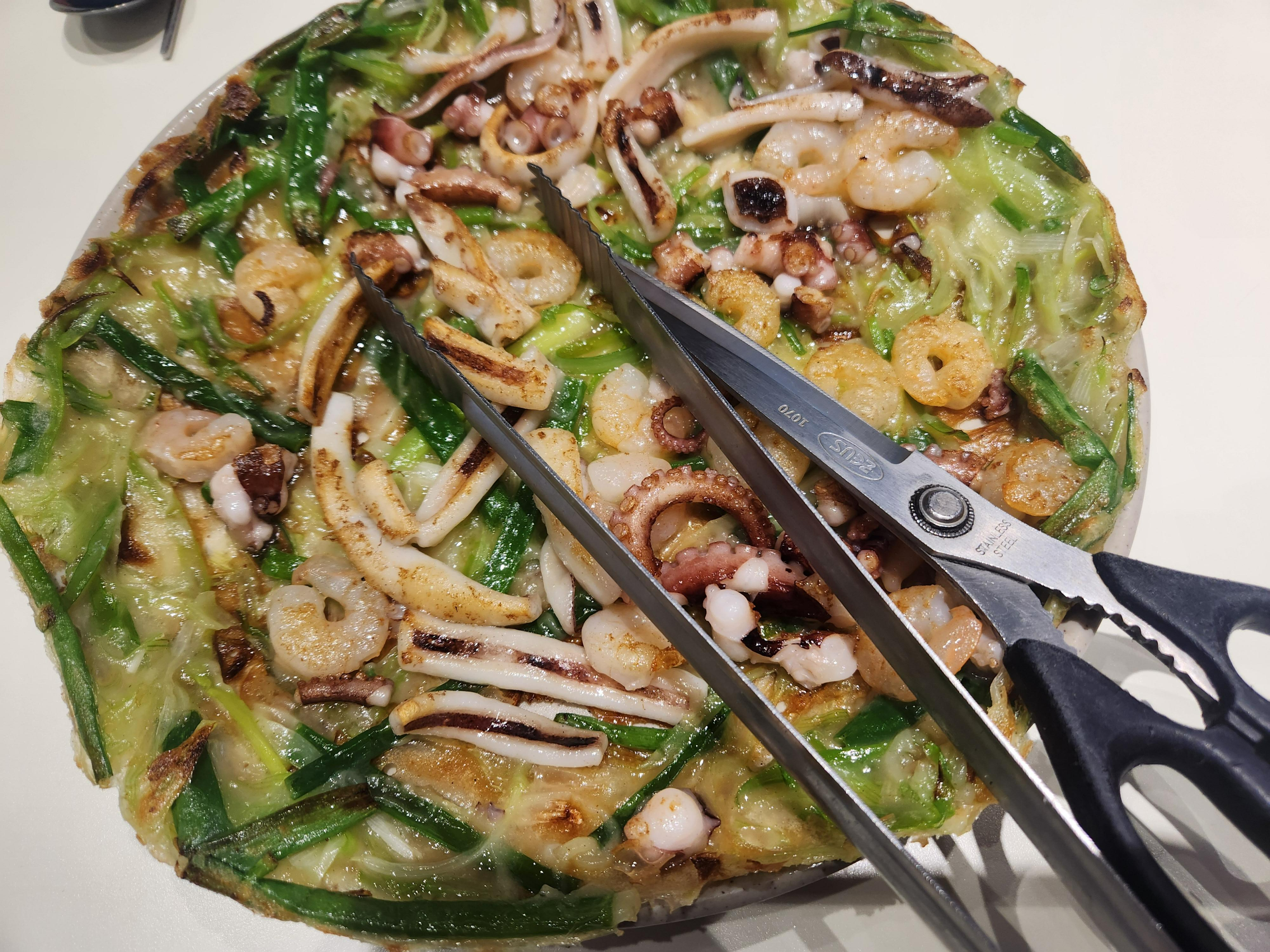 우선 먼저 낙지해물파전이 나왔습니다. 보통 해물파전이라고 하면 두껍고 막상 해물은 별로 없는 모습을 상상하는데 조조칼국수의 해물파전은 전혀 반대였습니다. 새우와 오징어 낙지, 조개가 골고루 많이 들어가 있어서 진짜 해물파전 느낌이 났고 반죽은 매우 얇아서 부담 없이 먹기 좋았습니다. 성인 둘이 가서 칼국수만 먹기 아쉬워서 해물파전을 시키자니 양이 너무 많을 것 같다고 고민할 수도 있으실 텐데, 불필요하게 밀가루 반죽이 많지 않아서 좋은 것 같습니다.