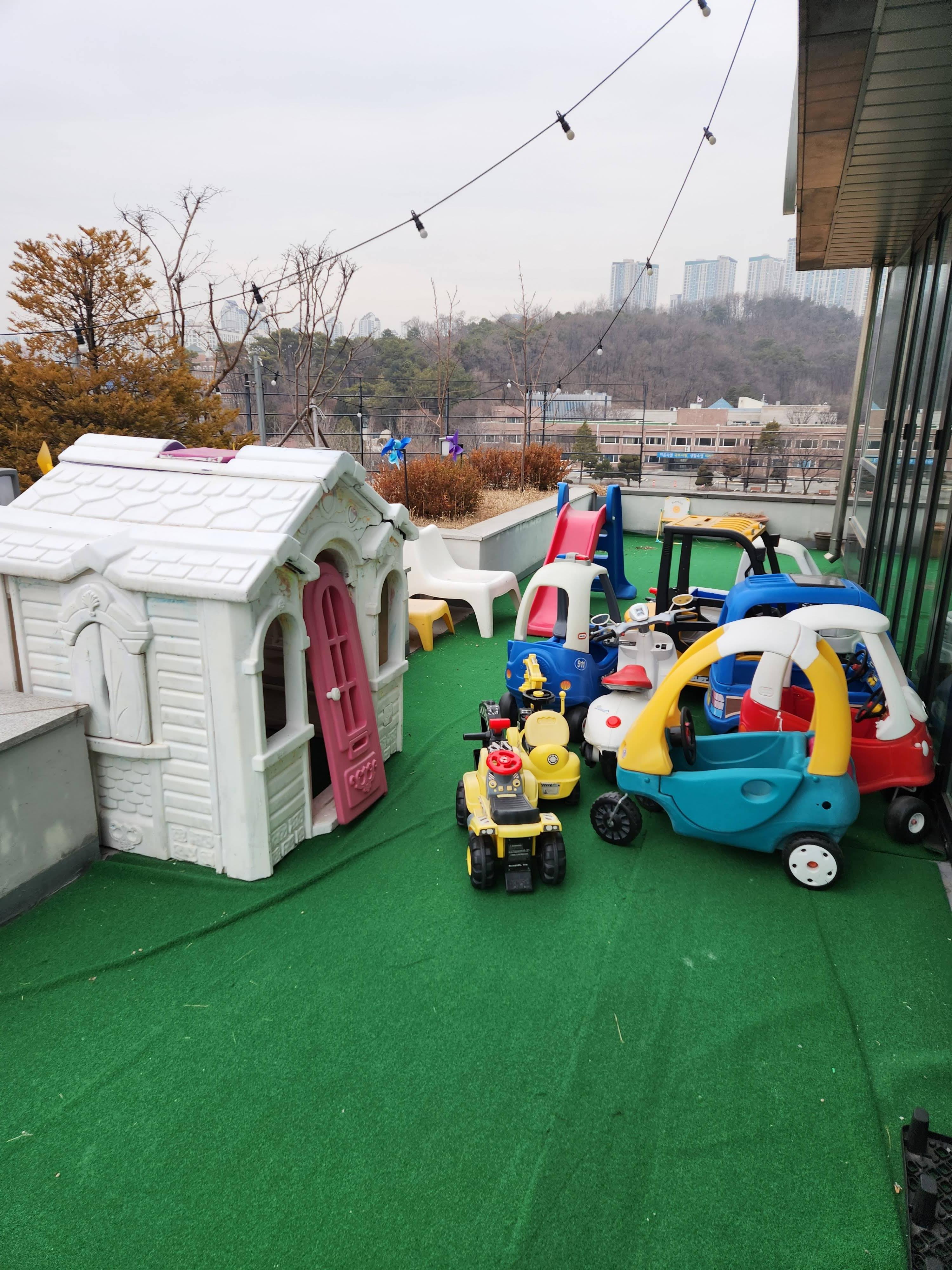 밖에는 장난감 놀이시설이 조금 갖춰져 있다. 날씨가 좋을 때는 시작 전이나 끝난 후에 잠깐씩 놀 수 있을 것 같다. 아이가 좋아하는 자동차 위주로 있어서 굉장히 좋아할 것 같다.