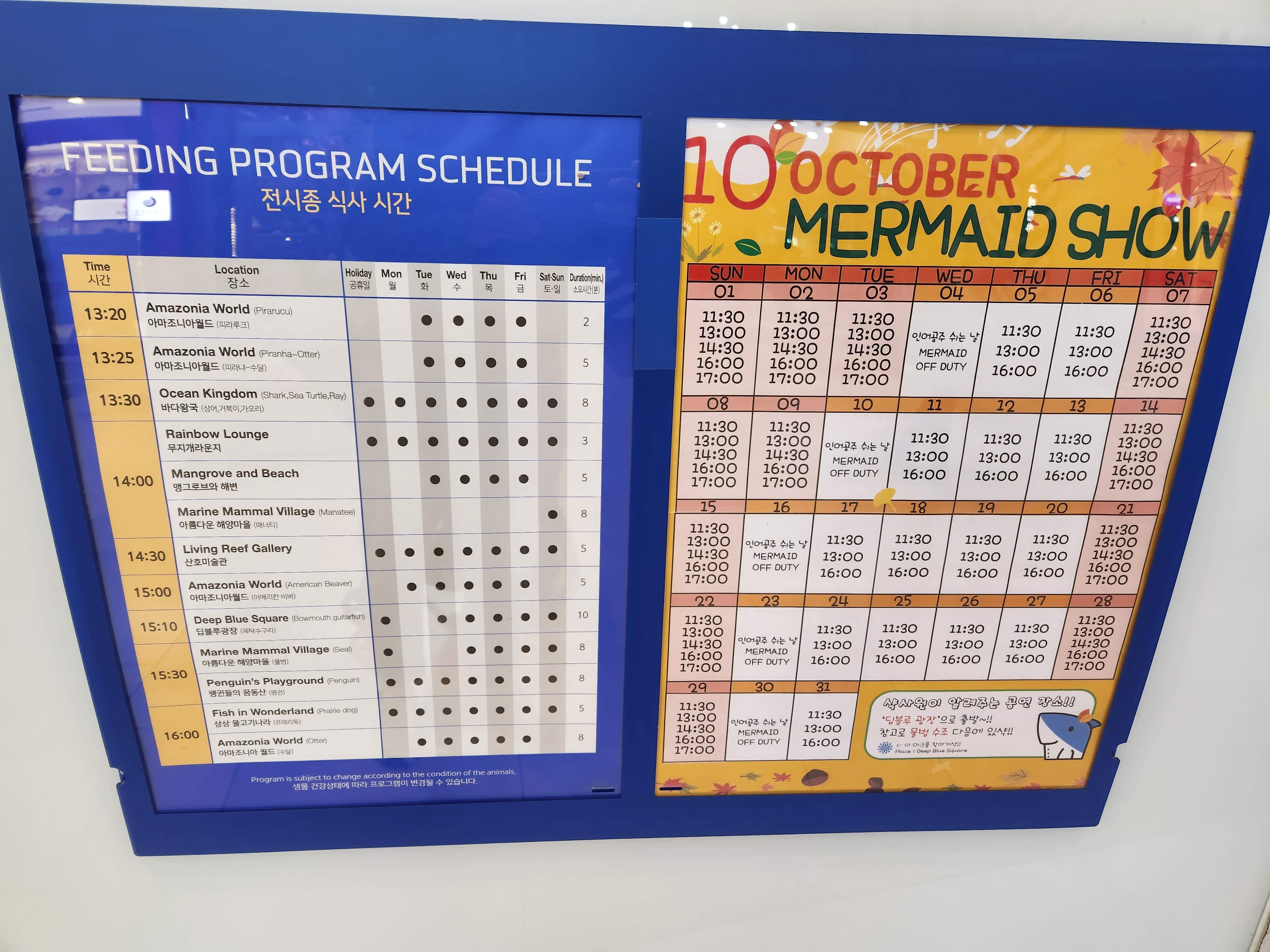 각 장소에 따라서 먹이를 주는 시간과 공연이 아래와 같은 스케쥴로 진행이 됩니다. 저희는 딱히 시간에 구애받는 걸 좋아하지 않아서 관람하지는 않았습니다.