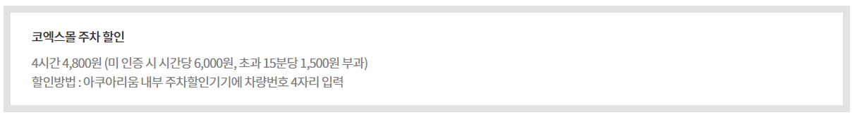 주차는 무료가 아니라 4시간 4,800원으로 할인이 되었습니다. 삼성역, 코엑스 여서 그런지 주차 요즘을 많이 받는 게 조금 아쉬웠습니다.