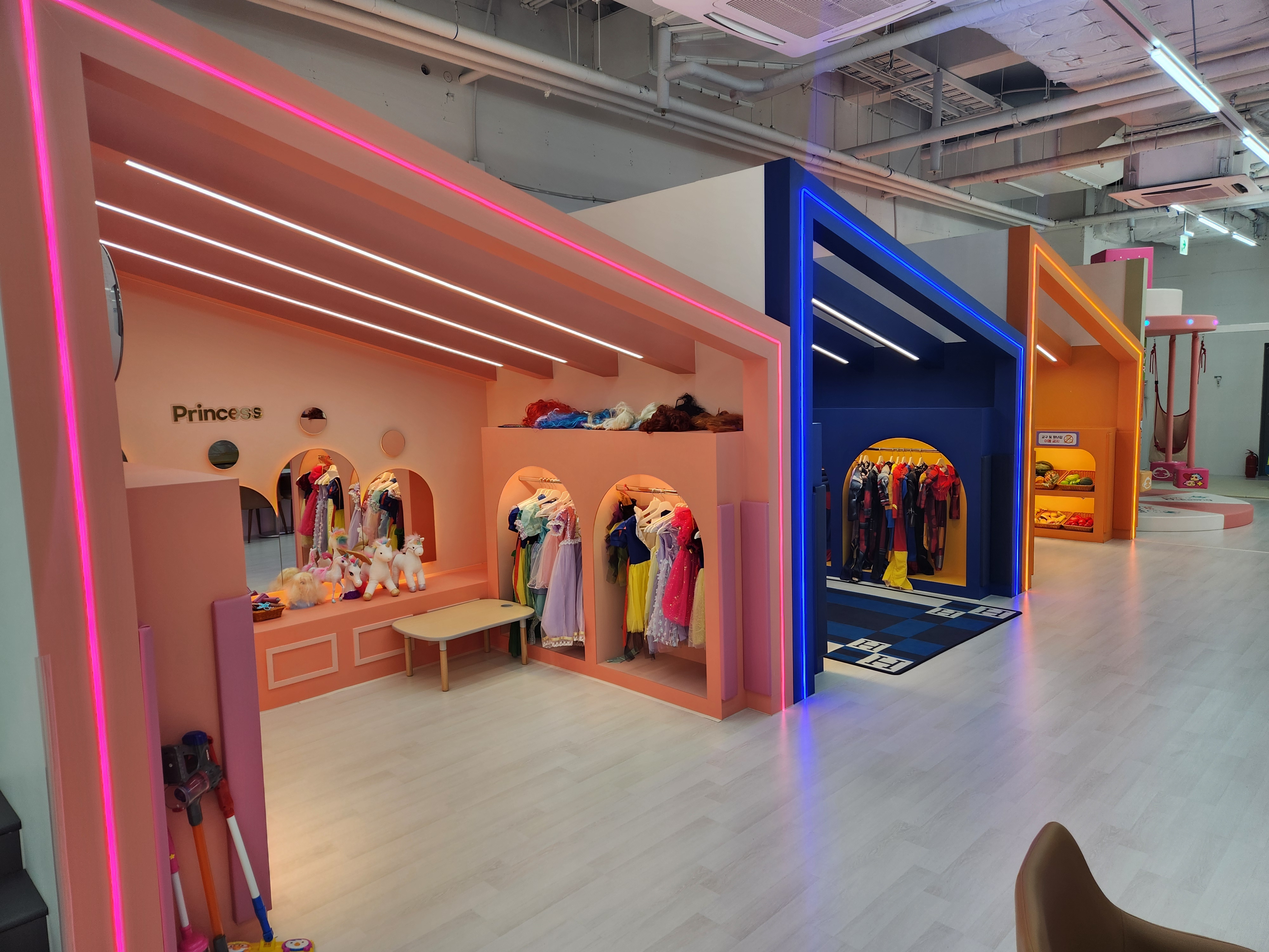 여자아이, 남자아이, 소꿉놀이 콘셉트의 작은 공간들도 마련되어 있습니다. 특히 옷 종류가 많아서 옷 갈아입고 노는 아이들도 많이 보였습니다.
