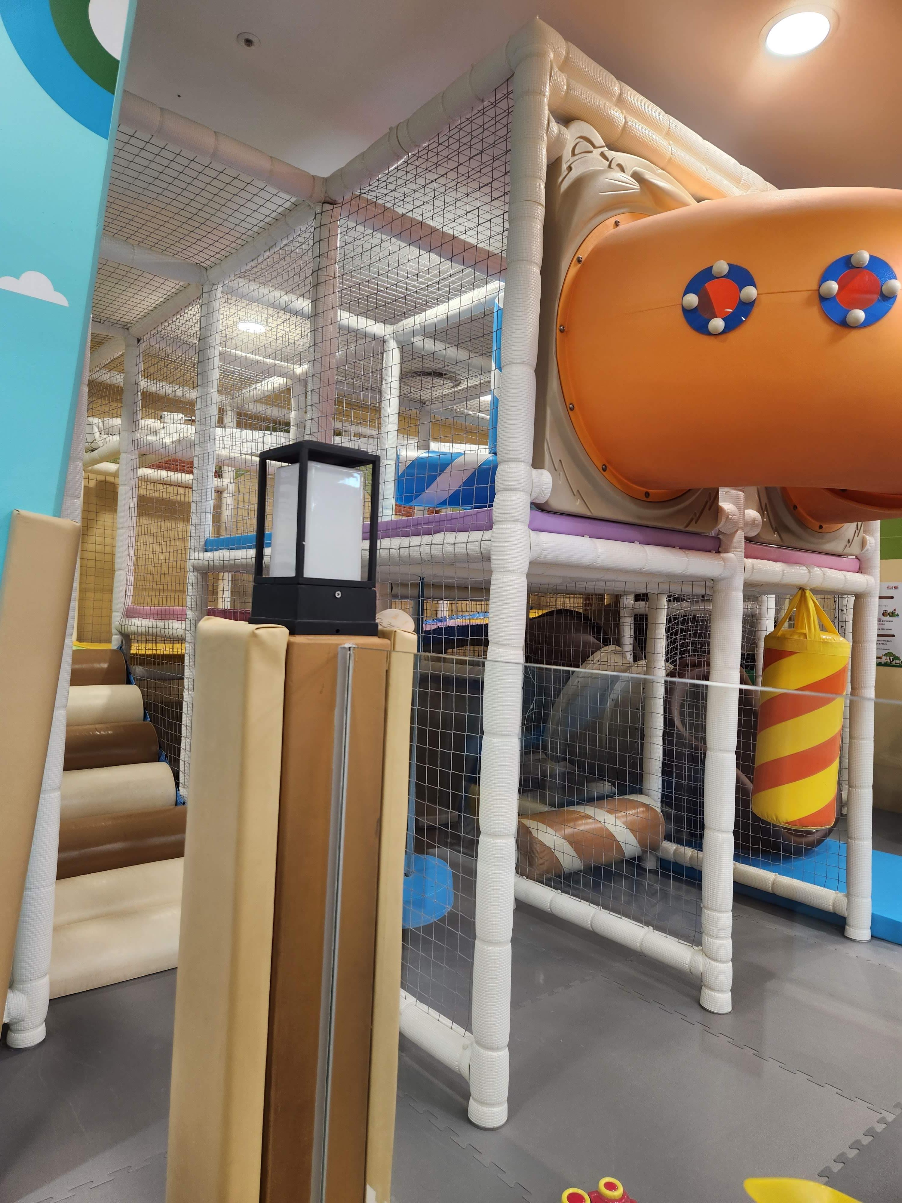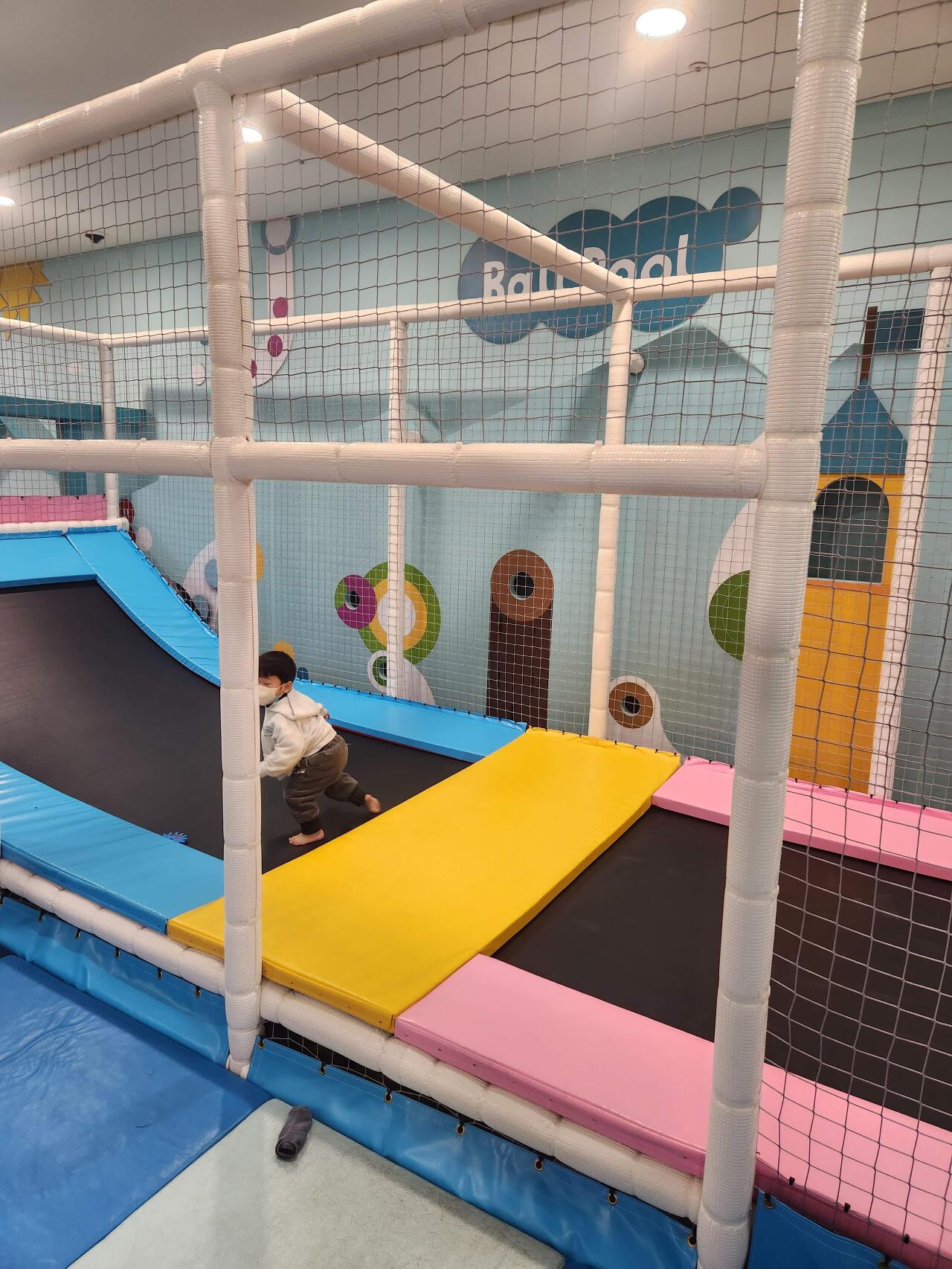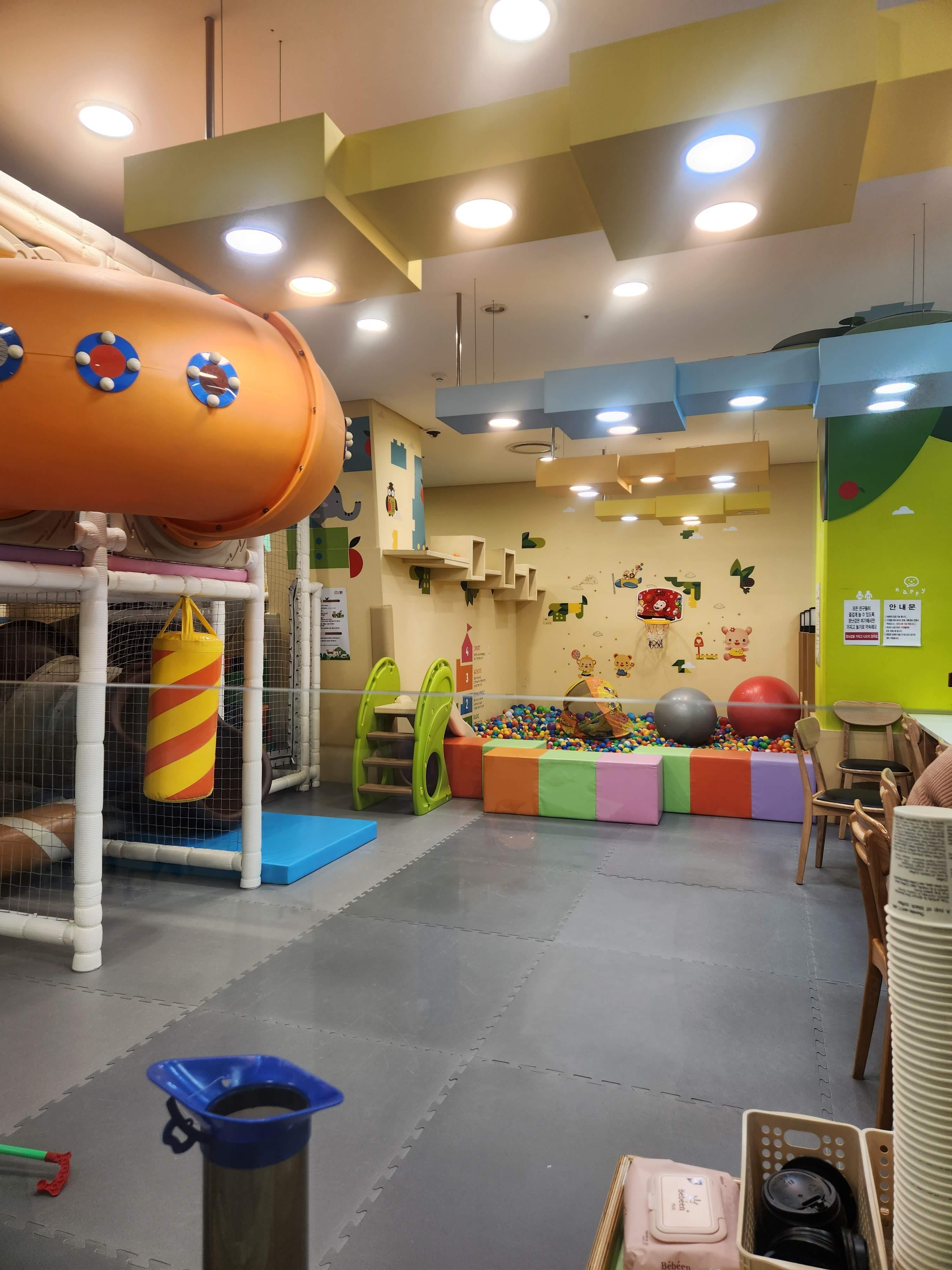 키즈카페라면 대부분 보유하고 있는 구조물이 다소 조그마하게 있다. 간단하지만 사실 엄청 커도 별로 필요한지 잘 모르겠다. 미끄럼틀만 있으면 되는데 미끄럼틀이 하나밖에 없어서 조금 아쉽다. 볼풀장도 갖춰져 있고 조그만 미끄럼틀과 농구대가 걸려 있었다. 또 여기가 살짝 위쪽이고 아래가 내려다 보이는 구조여서 부모님들이 앉아서 쉬고 물이나 간단한 커피를 마실 수 있는 시설이 마련되어 있었다.