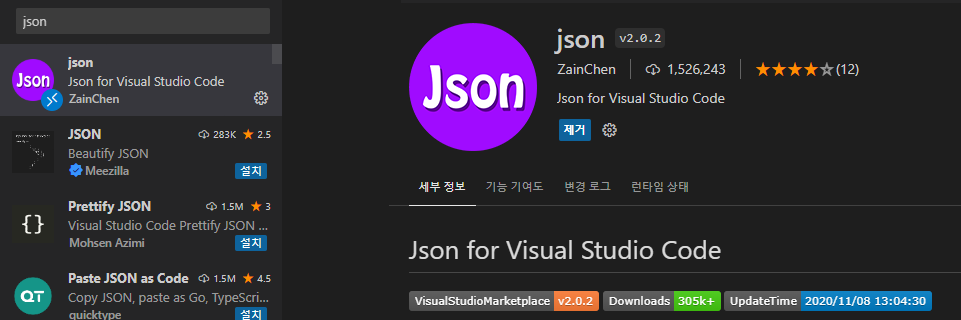 가장 먼저 json 이라는 VS Code 확장을 설치했다. 제대로 활용하기 위해 요즘 확장의 도움을 받는 것은 필수인 것 같다.