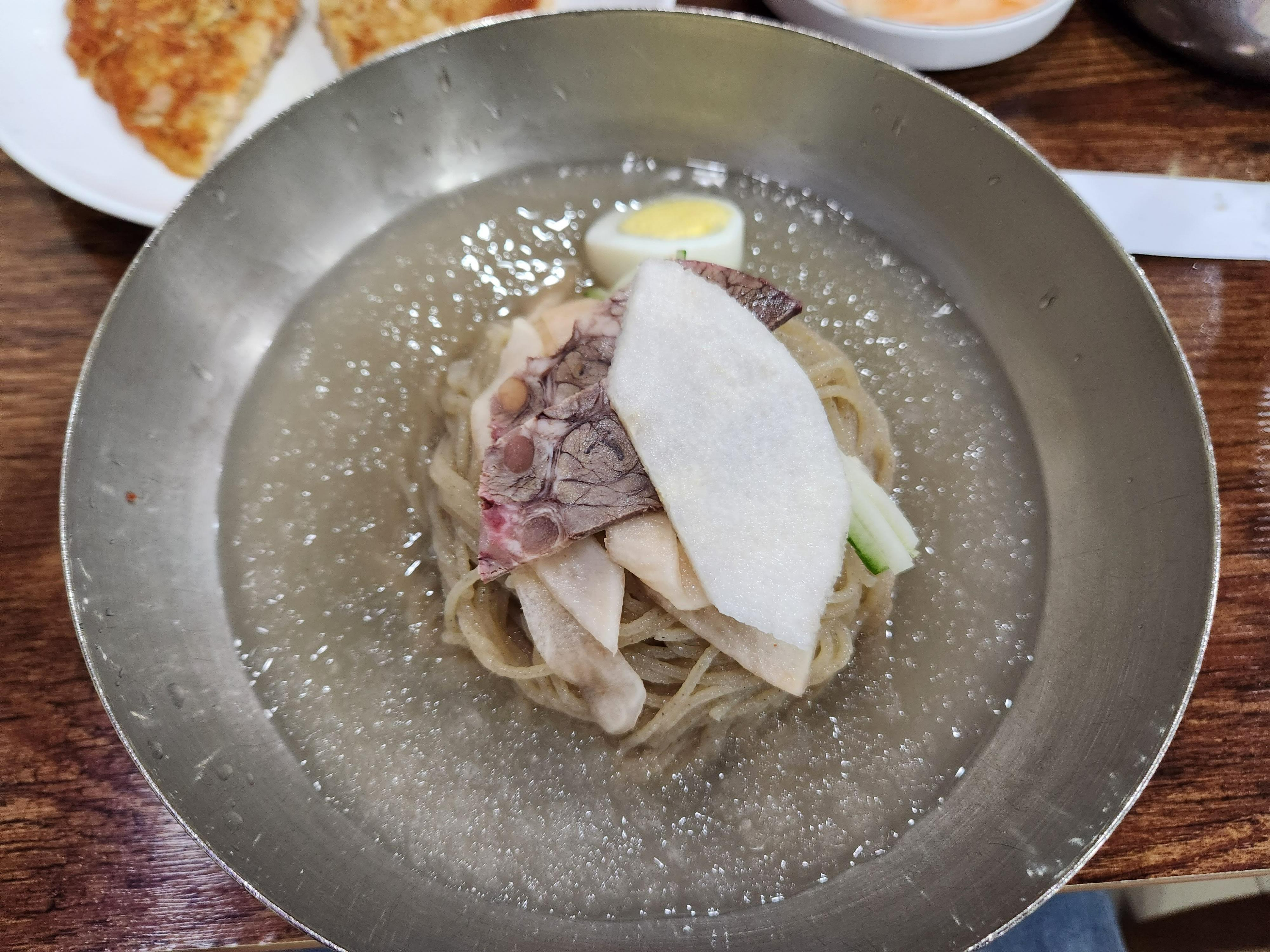 일반적으로 생각하는 평양냉면에 비해서 간은 조금 있는 편입니다. 다른 함흥냉면 처럼 톡 쏘는 느낌은 아니지만 그래도 짭짤하다고 느낄 정도로 간은 되어 있었습니다.