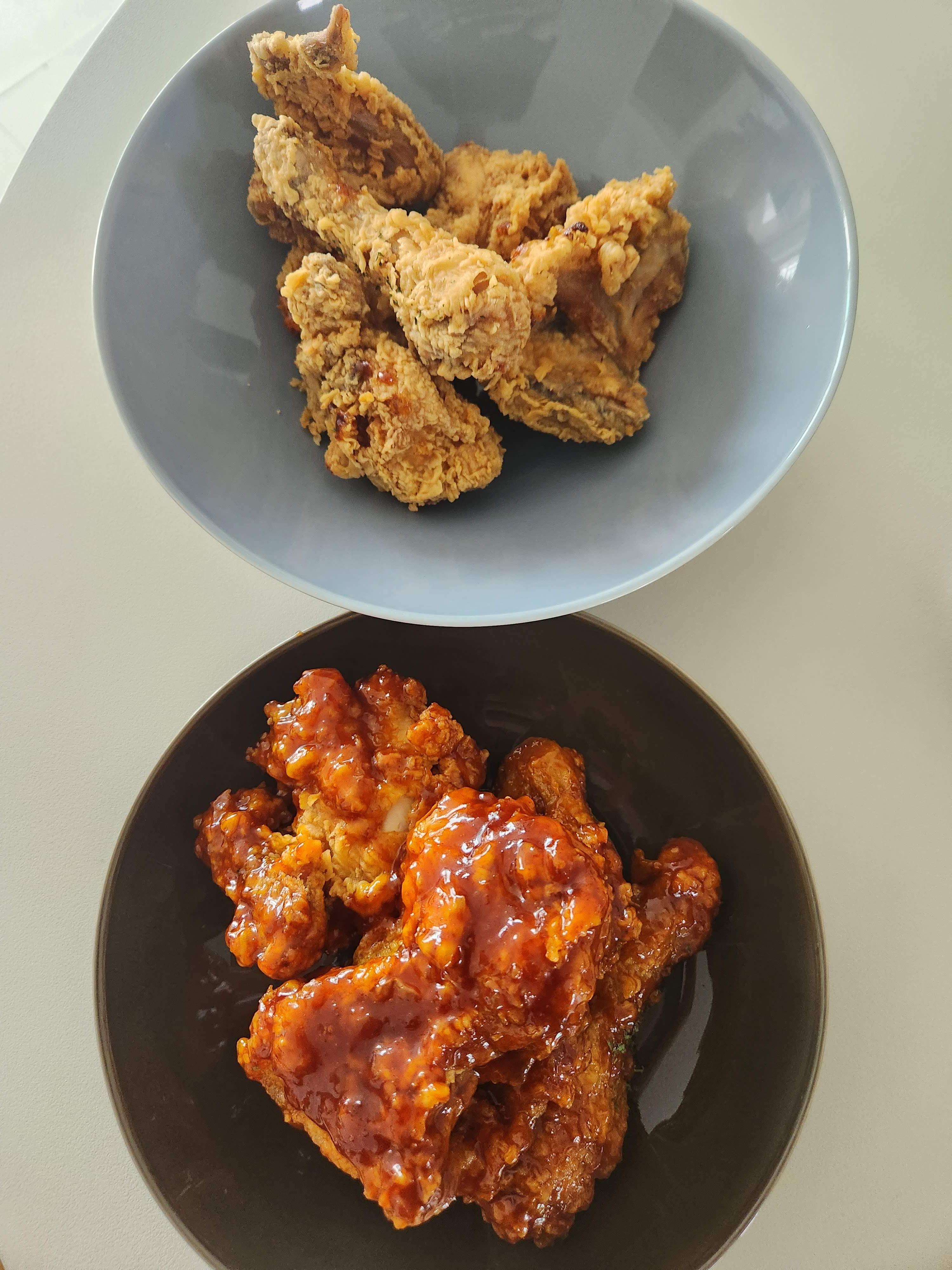 저는 반반치킨을 구매했고 후라이드와 양념이 있었습니다. 개인적으로 후라이드는 바삭하게 에어프라이어에 돌려서 먹는 게 나은 것 같고, 양념은 굳이 데우지 않아도 닭강정 느낌으로 먹어도 괜찮은 것 같습니다.