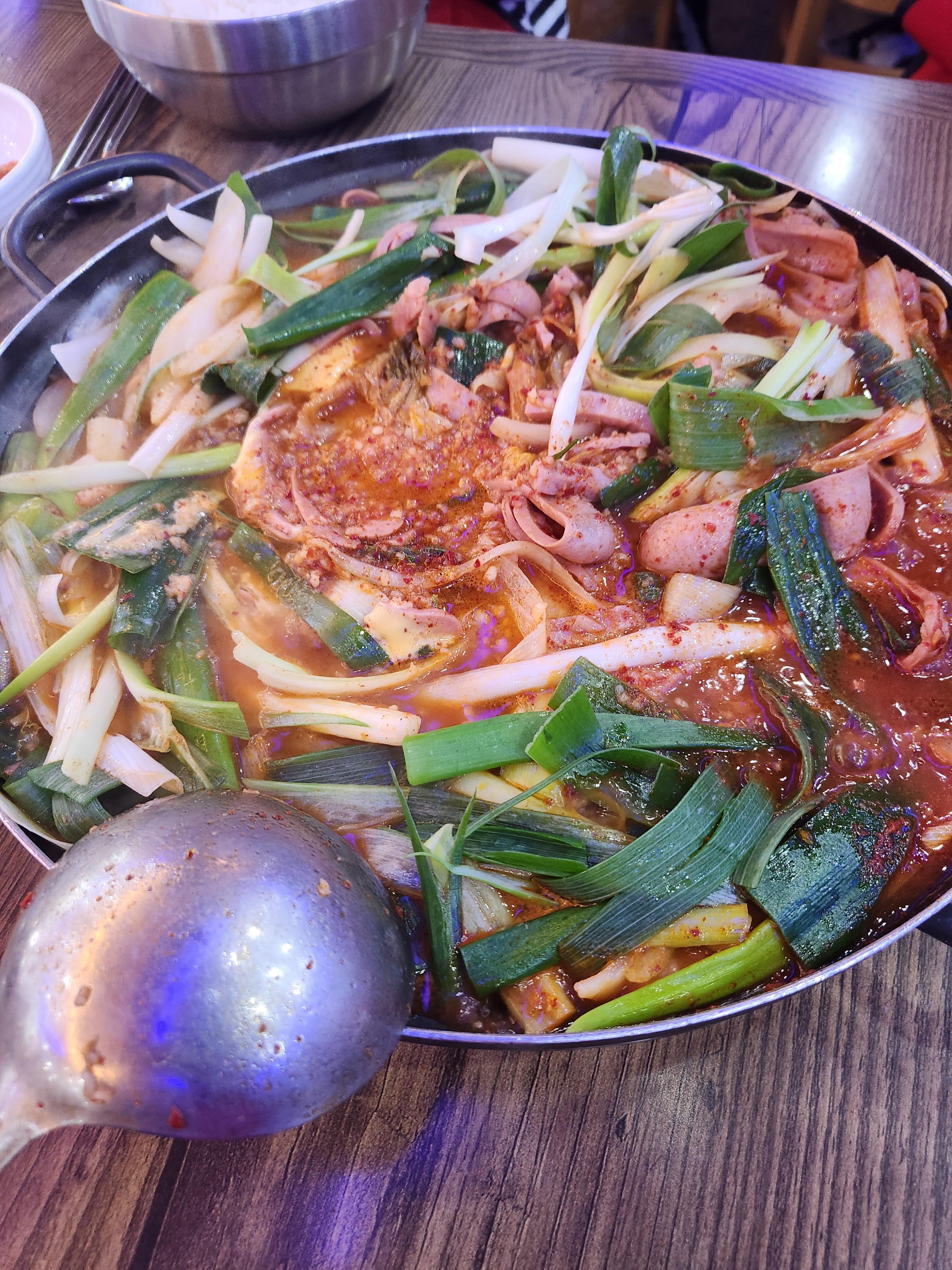 파와 마늘을 많이 넣은 얼큰하고 자극적인 부대찌개입니다. 먹을 때는 누구나 맛있게 먹을 정도로 괜찮은데 사실 먹기 전과 후에 파, 마늘 냄새가 진동을 해서 조금 힘든 메뉴입니다. 파가 좀 쌔면 속이 약간 쓰릴 때도 있지만 그래도 한 번씩 생각나는 잘 만들어진 부대찌개라고 생각합니다.