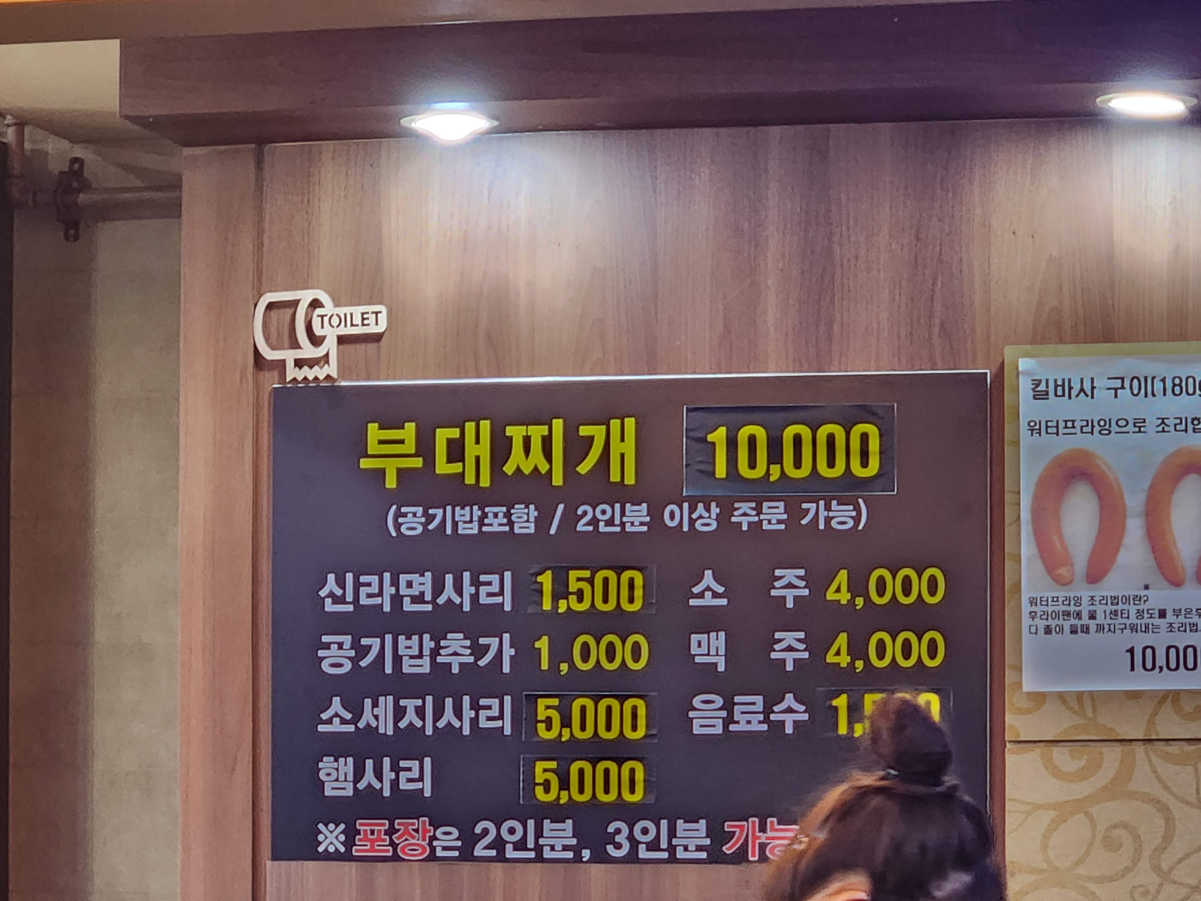메뉴는 부대찌개 단일 메뉴에 각종 사리를 추가할 수 있습니다. 공깃밥이 포함되어 있고, 신라면 사리라는 점이 특이하네요.
