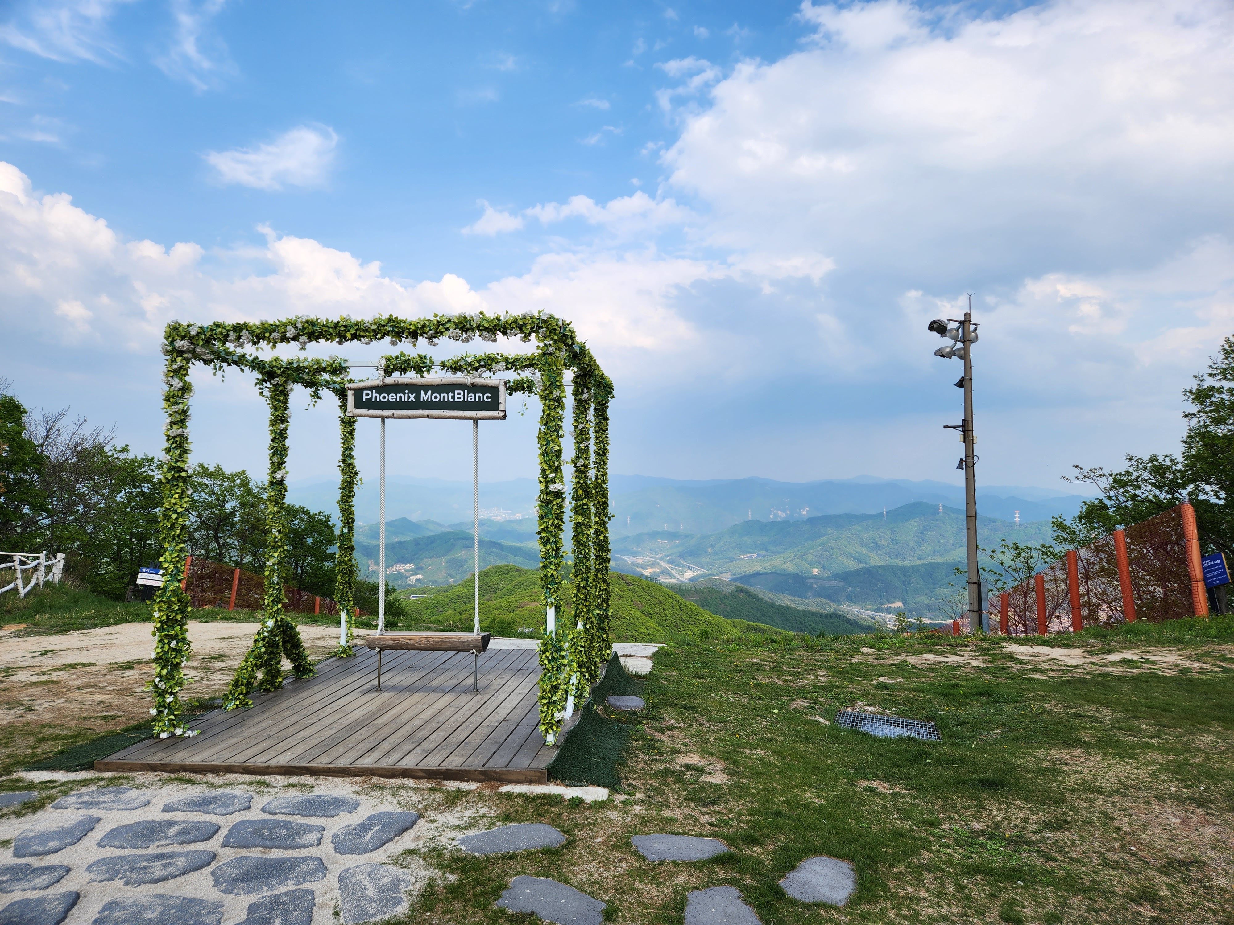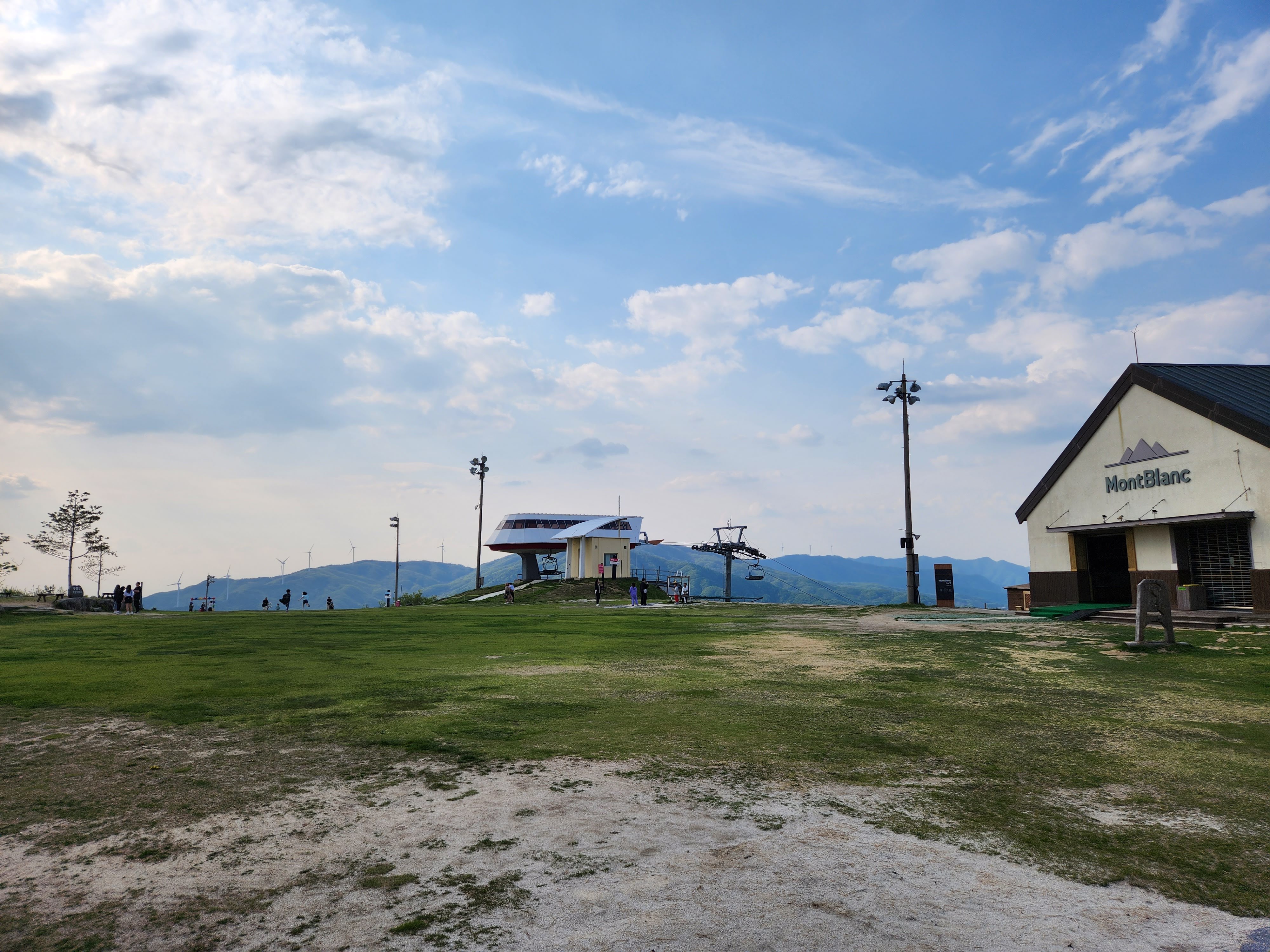 곤돌라는 타고 산 정상으로 올라갑니다. 몽블랑이라는 곳에 도착하는데 공기가 맑고 매우 시원했습니다. 아래로 강원도의 산이 내려다 보이고 중간중간 풍력발전기들이 보였습니다. 아래 사진처럼 포토스팟도 있고 잠깐 산책하기 괜찮아 보였습니다.