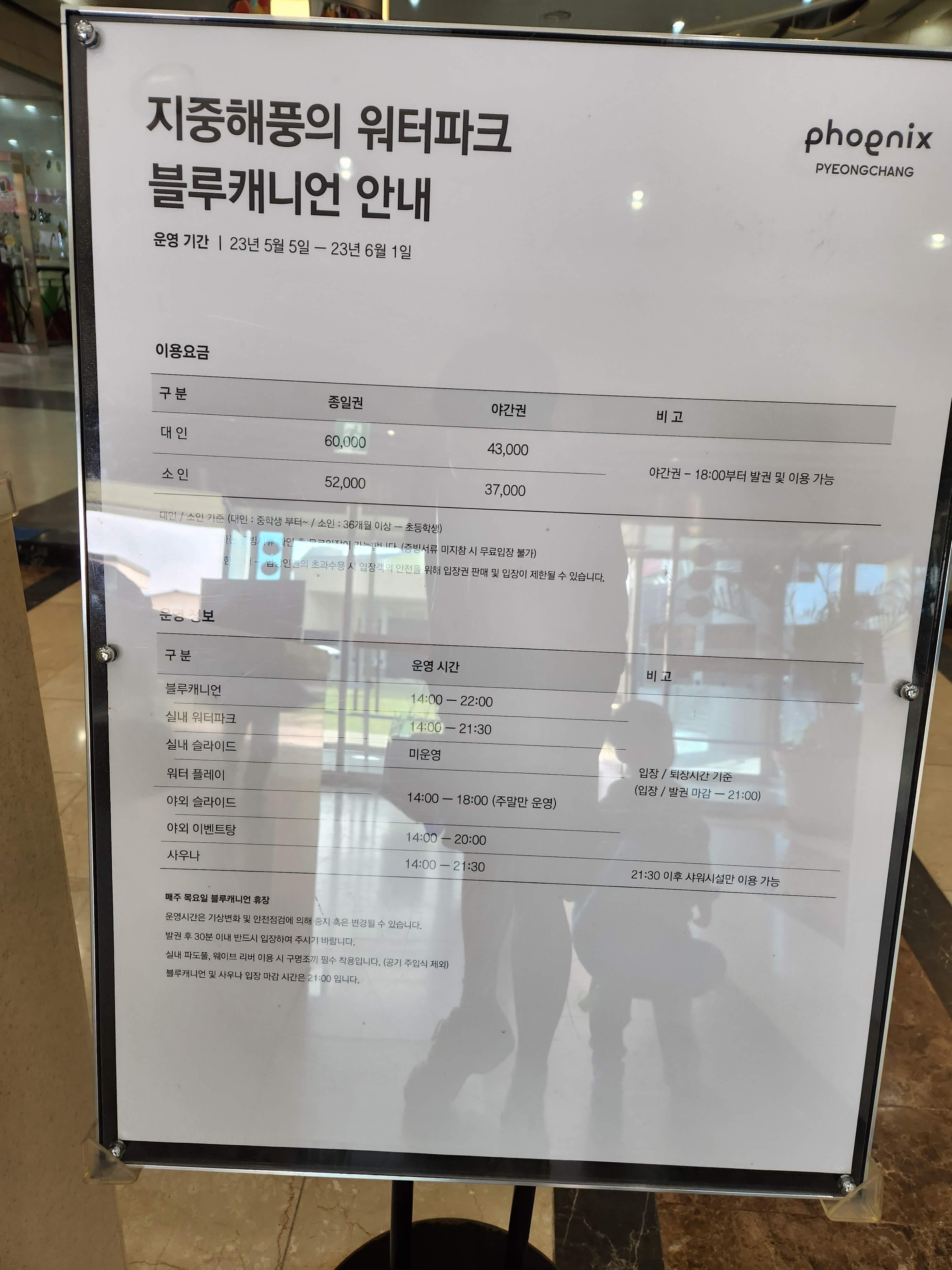 휘닉스 평창 단지 내에는 여러 가지 시설이 있는데 그중에서도 가장 유명한 게 워터파크 블루캐니언이 아닌가 싶습니다. 캐리비안베이나 다른 큰 워터파크 정도의 규모는 아니었지만 어느 정도 즐길 수 있는 규모였습니다.
