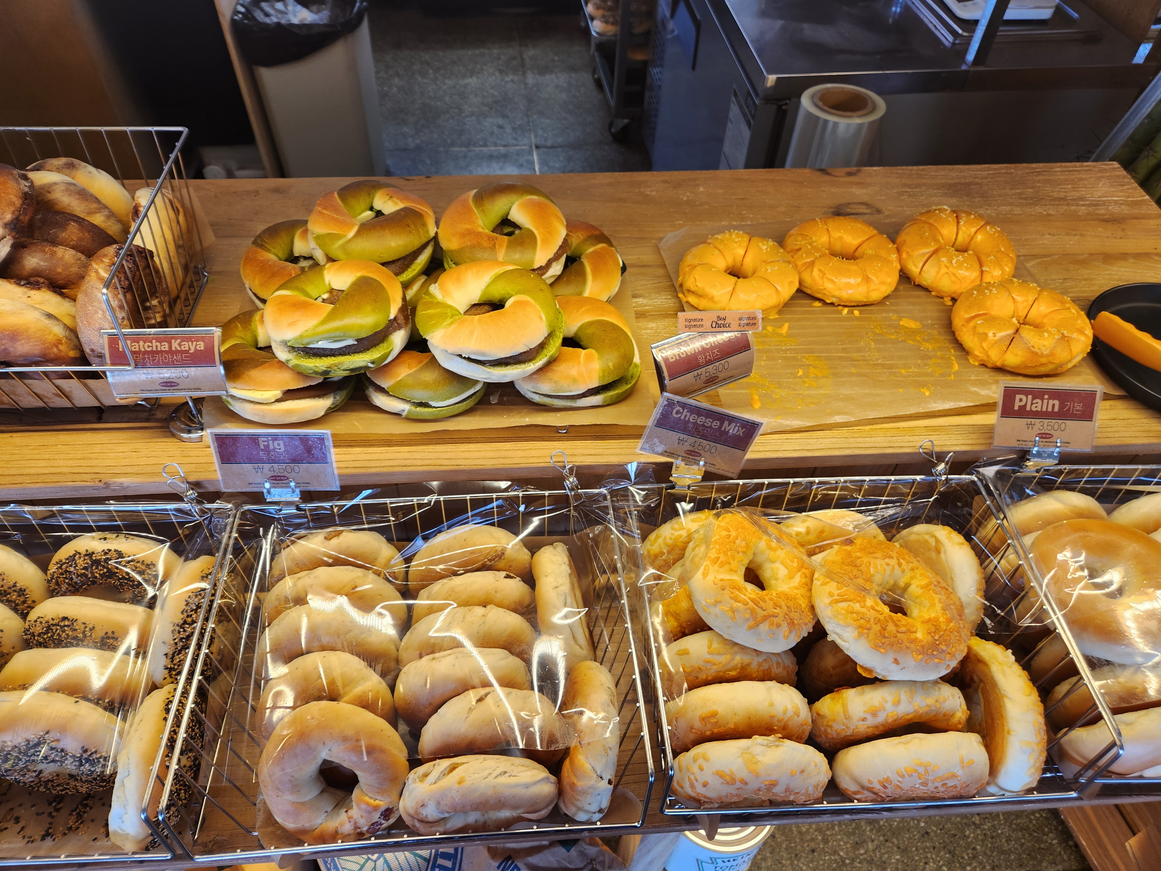 가격은 기본 베이글 3500원부터 4천 원~5천 원대가 가장 많았습니다. 내용물이 많이 들어간 베이글은 별도의 포장지에 싸져있었고 7천 원 정도 했습니다. 저렴한 편은 아니지만 베이글 전문점에 맛만 괜찮다면 요즘 물가를 고려하면 나름 합리적인 가격인 것 같습니다.