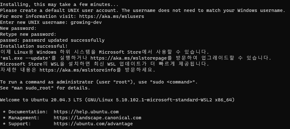 이 명령은 WSL을 실행하고 Linux의 Ubuntu 배포를 설치하는 데 필요한 기능을 사용하도록 설정하는 것입니다.