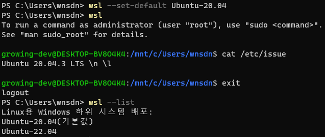 아래와 같이 20.04 버전으로 기본값을 변경하고 wsl 명령어로 진입한 뒤 아래 명령어로 확인하여 20.04 버전으로 기본 속이 되는지 확인하였고 exit 후 wsl --list를 하여 기본값이 20.04로 변경됨을 확인할 수 있다.